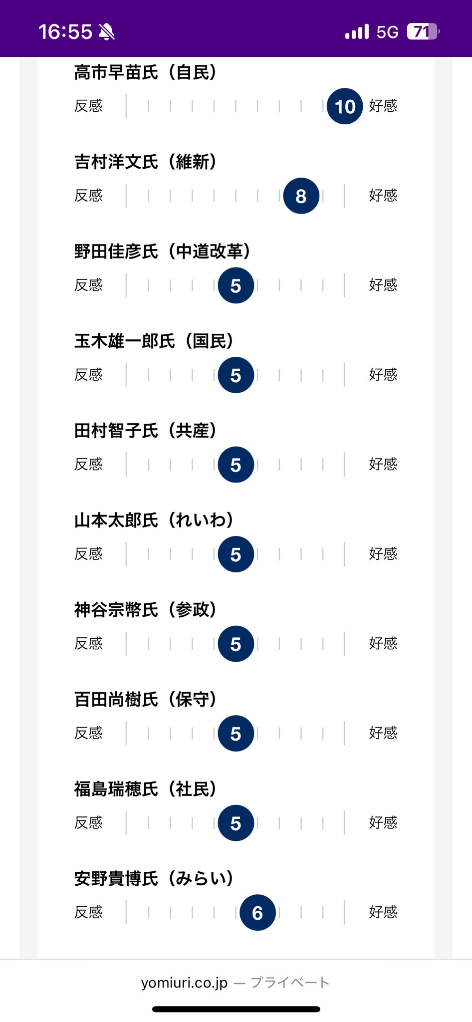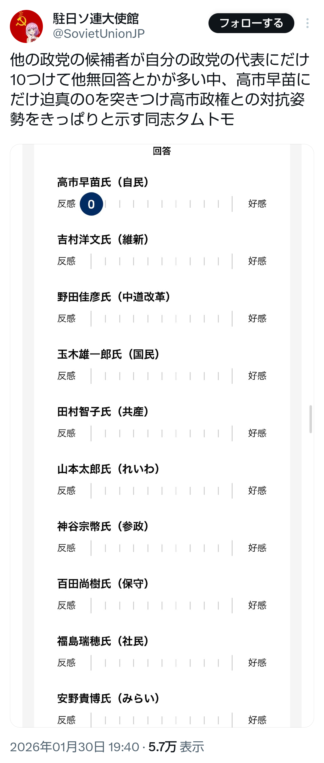 | … | 18無題Name名無し 26/01/30(金)22:46:53No.775639そうだねx1 1769780813985.png-(491618 B) >他の政党の候補者が自分の政党の代表にだけ10つけて他無回答とかが多い中、高市早苗にだけ迫真の0を突きつけ高市政権との対抗姿勢をきっぱりと示す同志タムトモ |