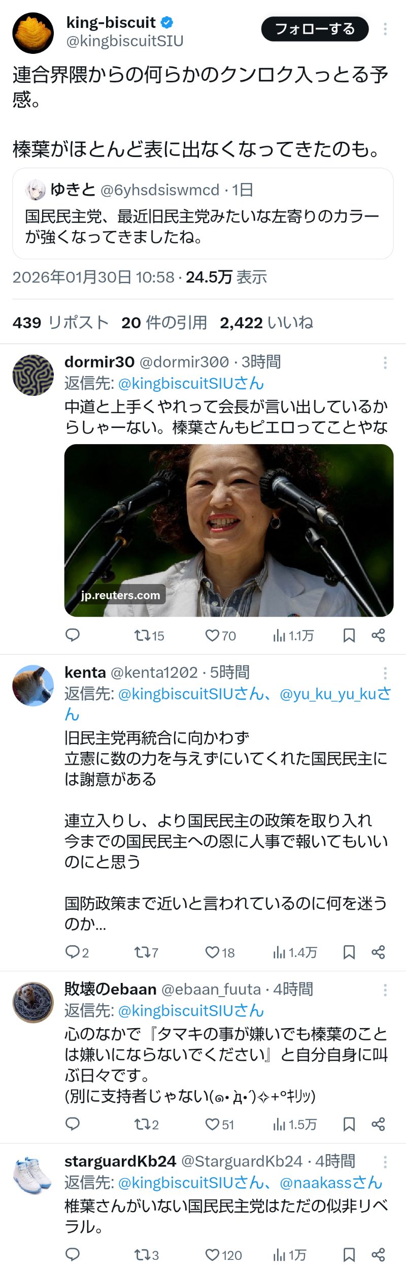 | … | 29無題Name名無し 26/01/30(金)23:54:23No.775651そうだねx5>榛葉が連合のおばちゃんに封じられてるのではという陰謀論 |