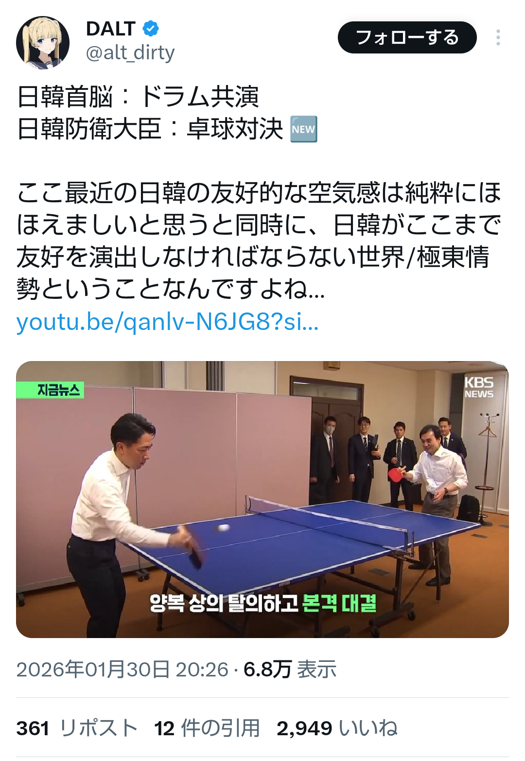 | … | 28無題Name名無し 26/01/30(金)23:40:17No.775650そうだねx1 1769784017336.jpg-(48172 B) >小泉進次郎防衛相、韓国国防相とネクタイ外してピンポン交流…重ねたラリーに「協力を前向きに続ける先例に」 |