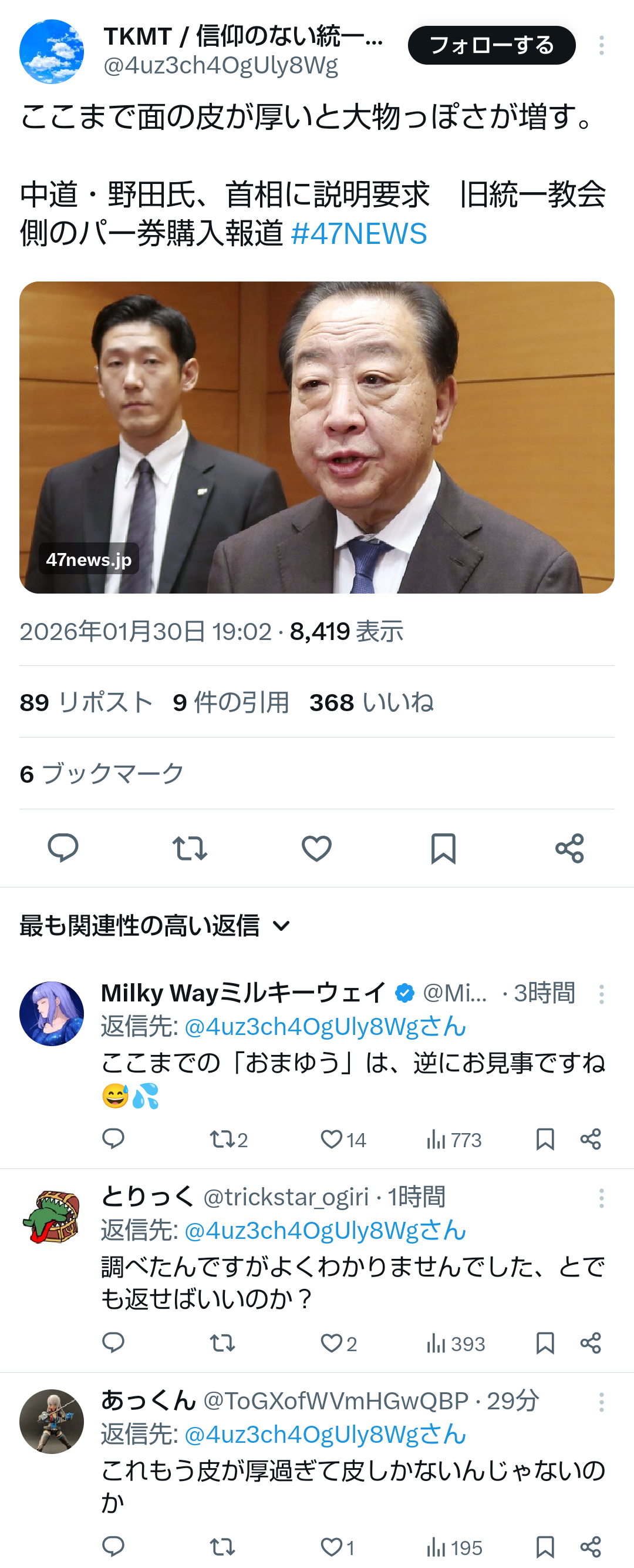 | … | 70無題Name名無し 26/01/31(土)02:02:15No.775702そうだねx2>>中道・野田氏、首相に説明要求 旧統一教会側のパー券購入報道 |