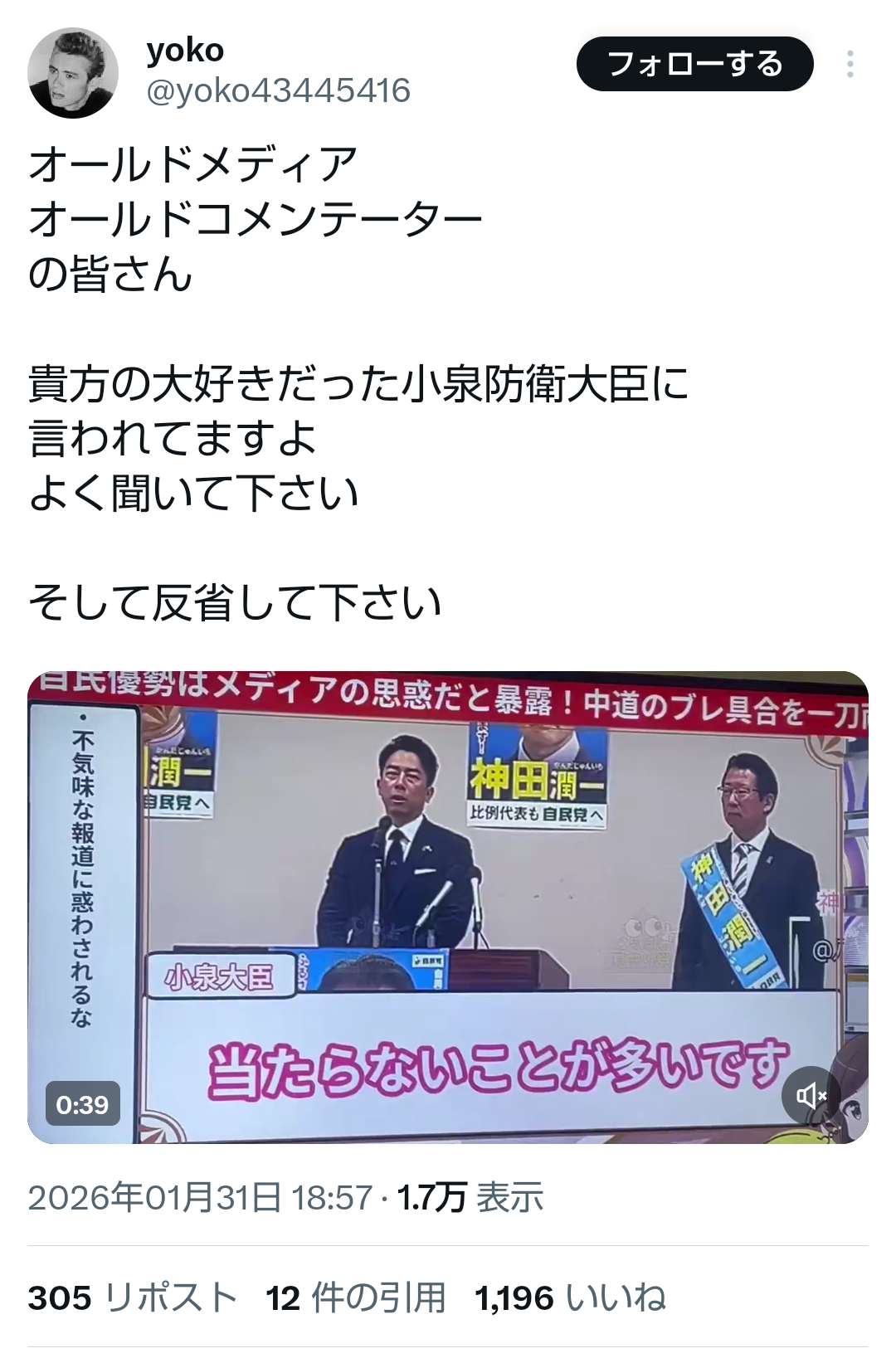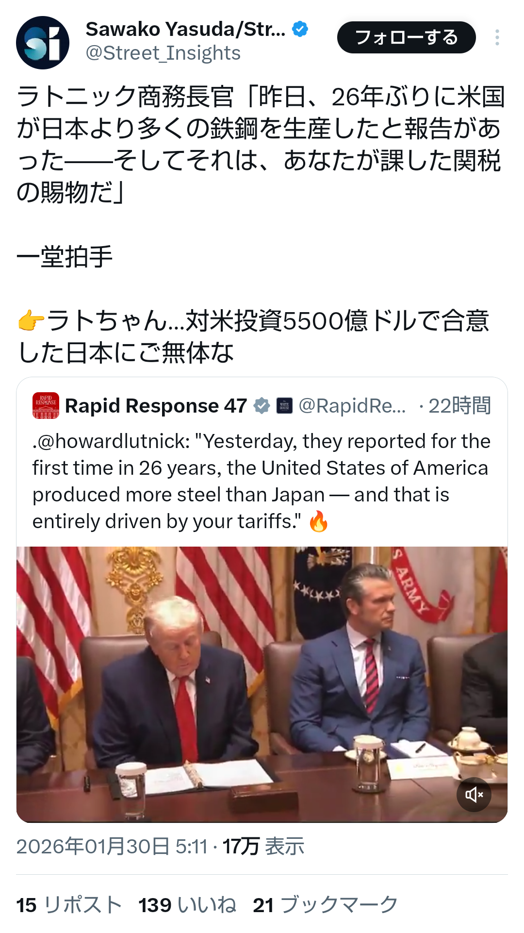 | … | 421無題Name名無し 26/02/01(日)17:18:12No.776141+ 1769933892662.png-(561264 B) https://x.com/i/status/2017791440592789809 |