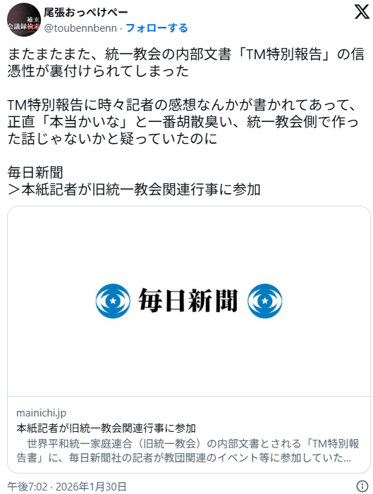 | … | 2無題Name名無し 26/01/30(金)22:16:56No.775623+>本紙記者が旧統一教会関連行事に参加 |