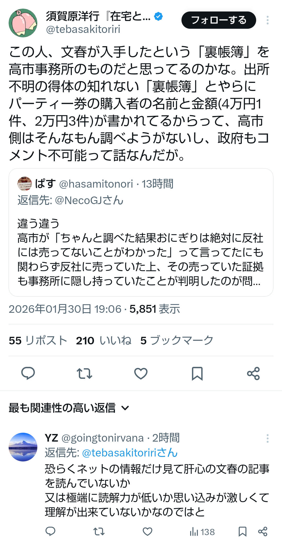 | … | 55無題Name名無し 26/01/31(土)00:48:48No.775685そうだねx1文春のスクープだけをネタに朝日や日経もパー券パー券やってるからね |