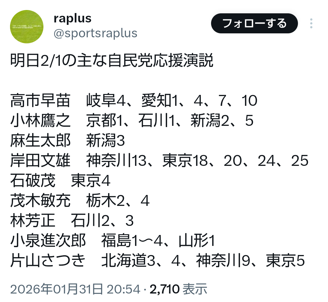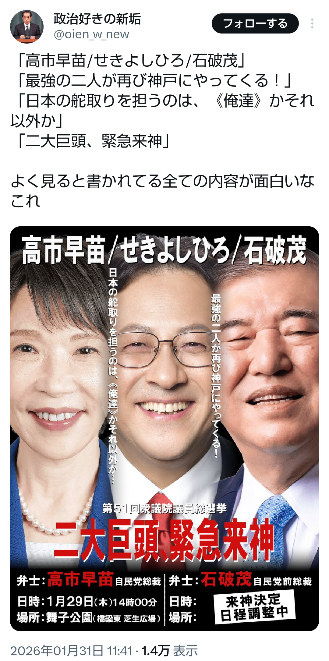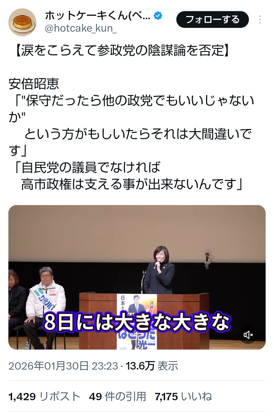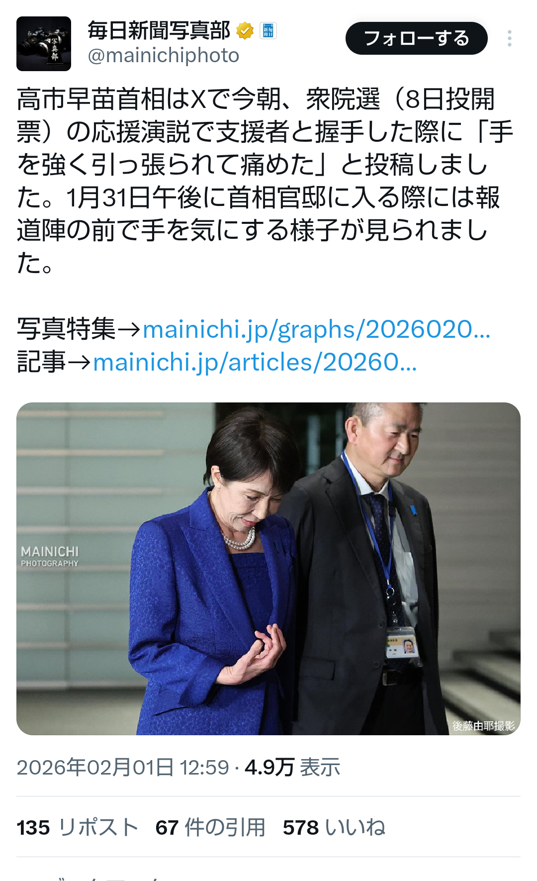 | … | 428無題Name名無し 26/02/01(日)17:45:42No.776148+腕痛めてるけど応援演説で全国飛び回る高市さんってストーリーはより一層人気を高めるバフだよな |