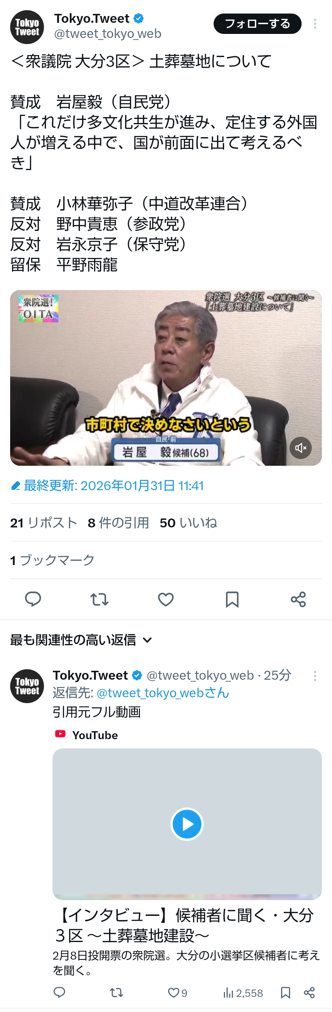 | … | 22無題Name名無し 26/01/30(金)22:59:54No.775643+告示が1/8で1/19に推薦してきた参政党は問題外だろ |