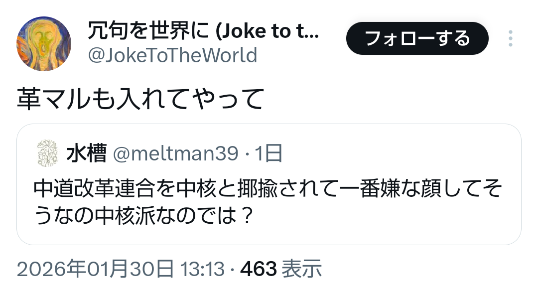 | … | 89無題Name名無し 26/01/31(土)09:28:36No.775723+>もしかして中道改革連合って名乗りたくない? |