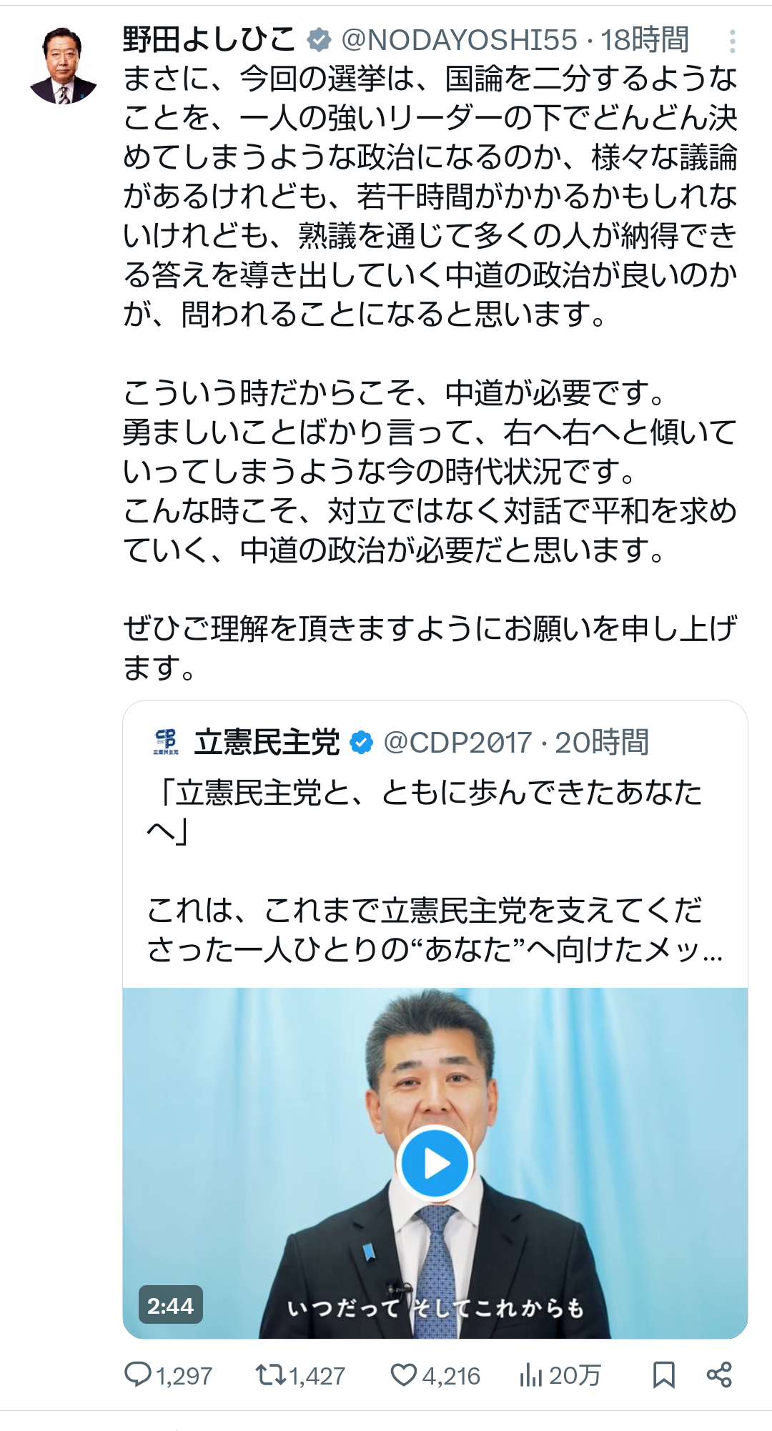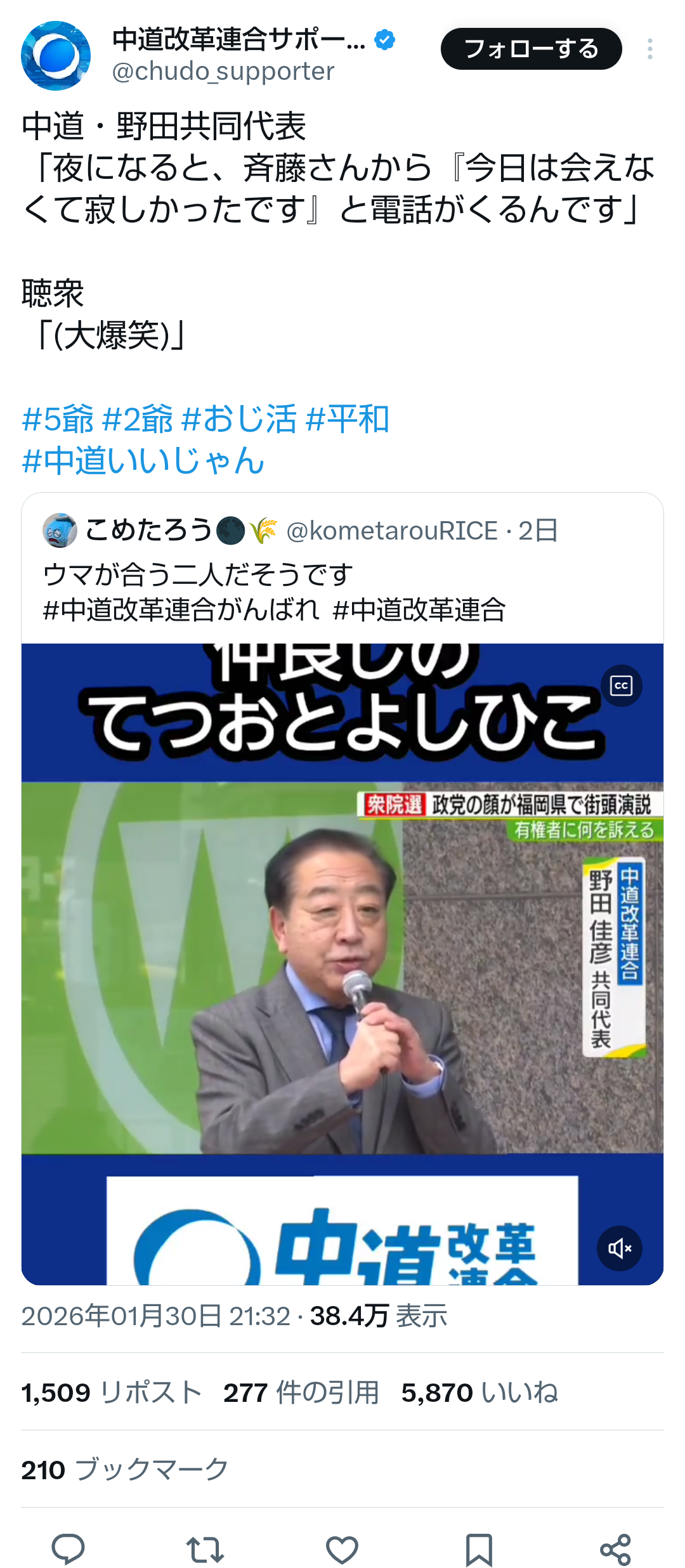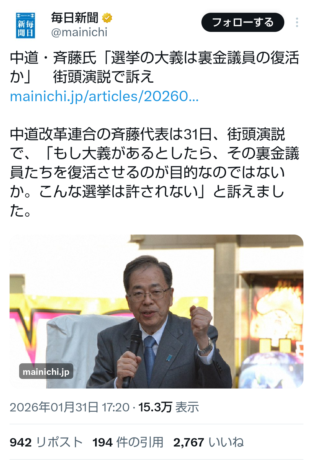 | … | 359無題Name名無し 26/02/01(日)13:12:44No.776060+野田が逃げた扱いになって斎藤は公明党アピールばかりって中道立憲の存在が哀れすぎるだろ |