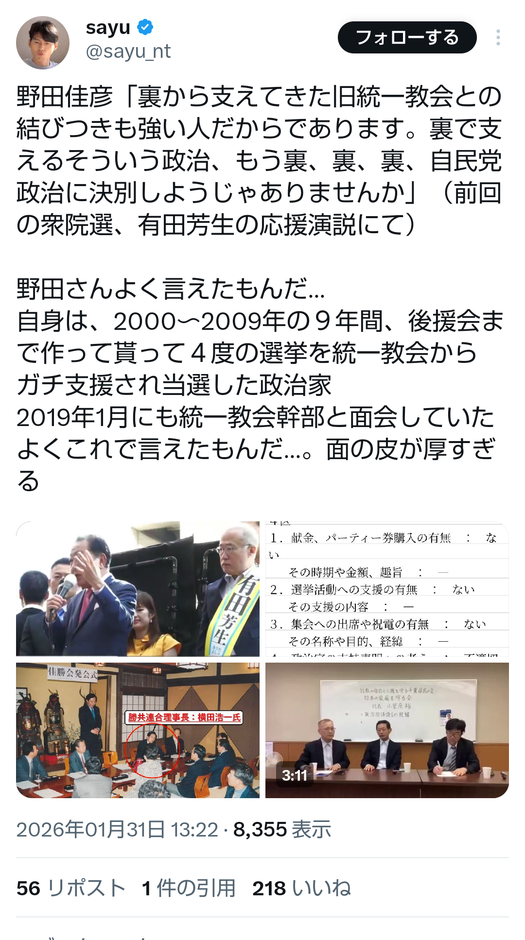 | … | 41無題Name名無し 26/01/31(土)00:27:01No.775667+>《裏帳簿入手》高市早苗氏「金銭のやり取りナシ」断言も統一教会友好団体がパーティ券を購入していた |