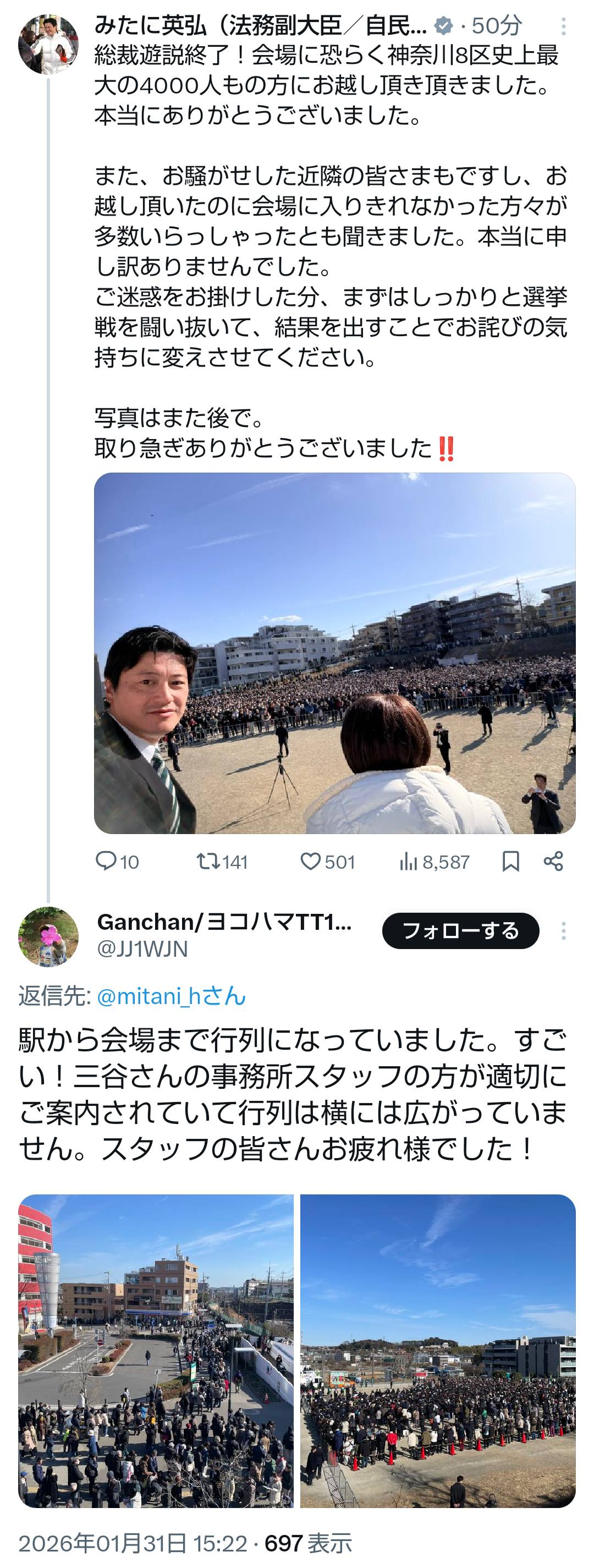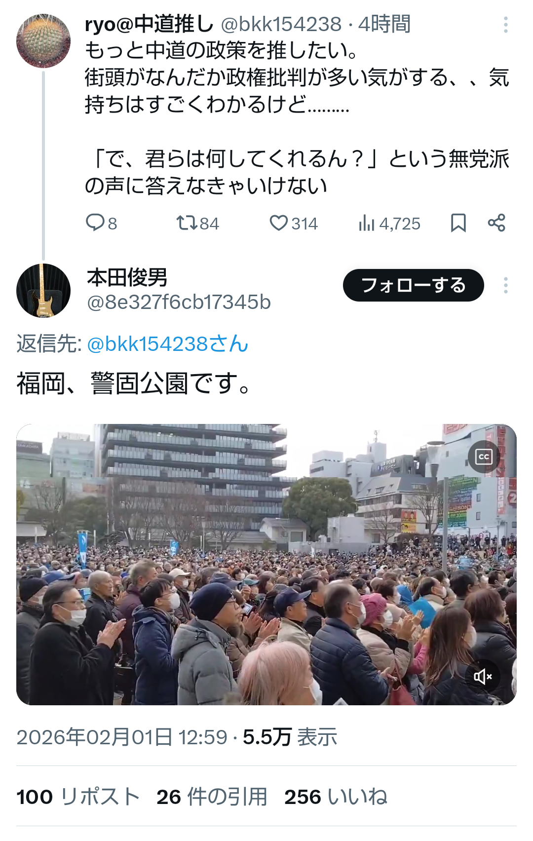 | … | 348無題Name名無し 26/02/01(日)12:54:30No.776049+近所だから岐阜4区の応援演説見に現地まで来たけど思ったより人来ててビビるわ |