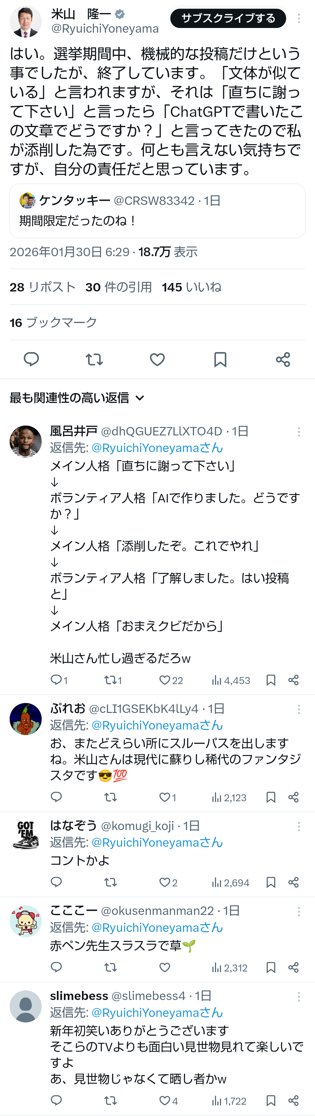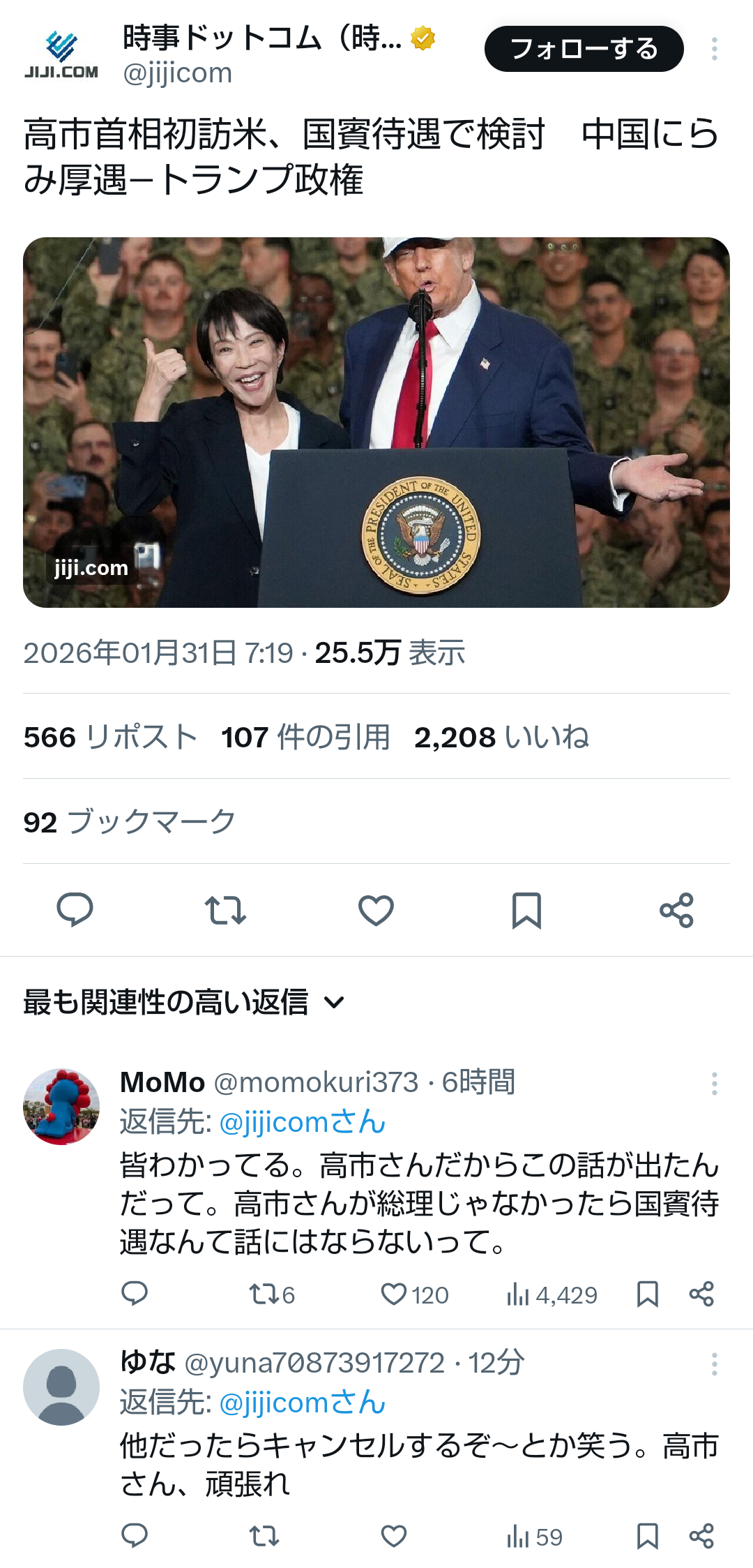 | … | 72無題Name名無し 26/01/31(土)03:50:19No.775705そうだねx3政府がノーコメント貫いてるから野党とマスコミがこれ幸いと攻めてるけど |