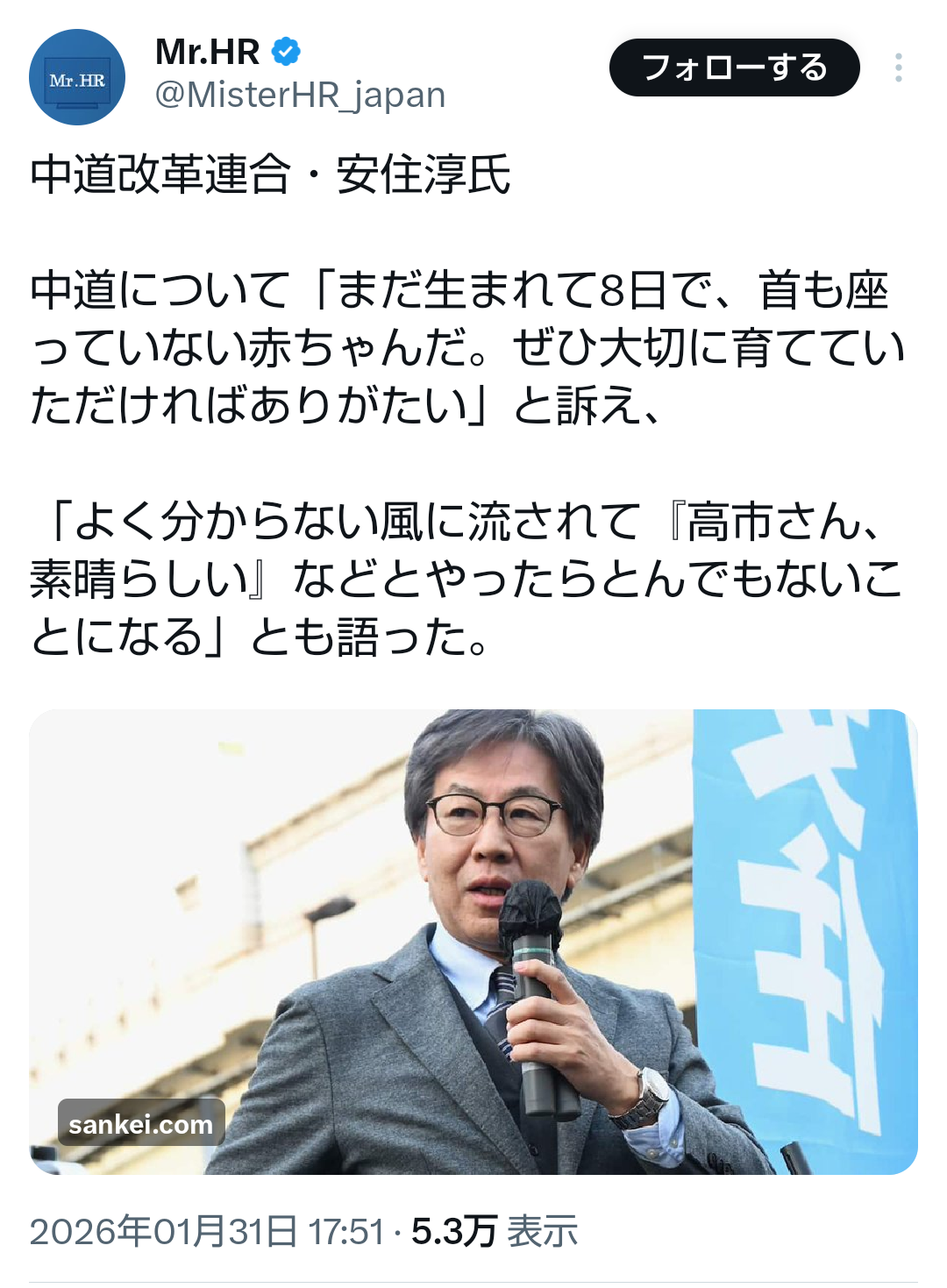 | … | 21無題Name名無し 26/01/30(金)22:52:42No.775642そうだねx1あれは保守分裂の上で参政党が後乗りしてきたやつだから跳ね除ければいいだけかな |