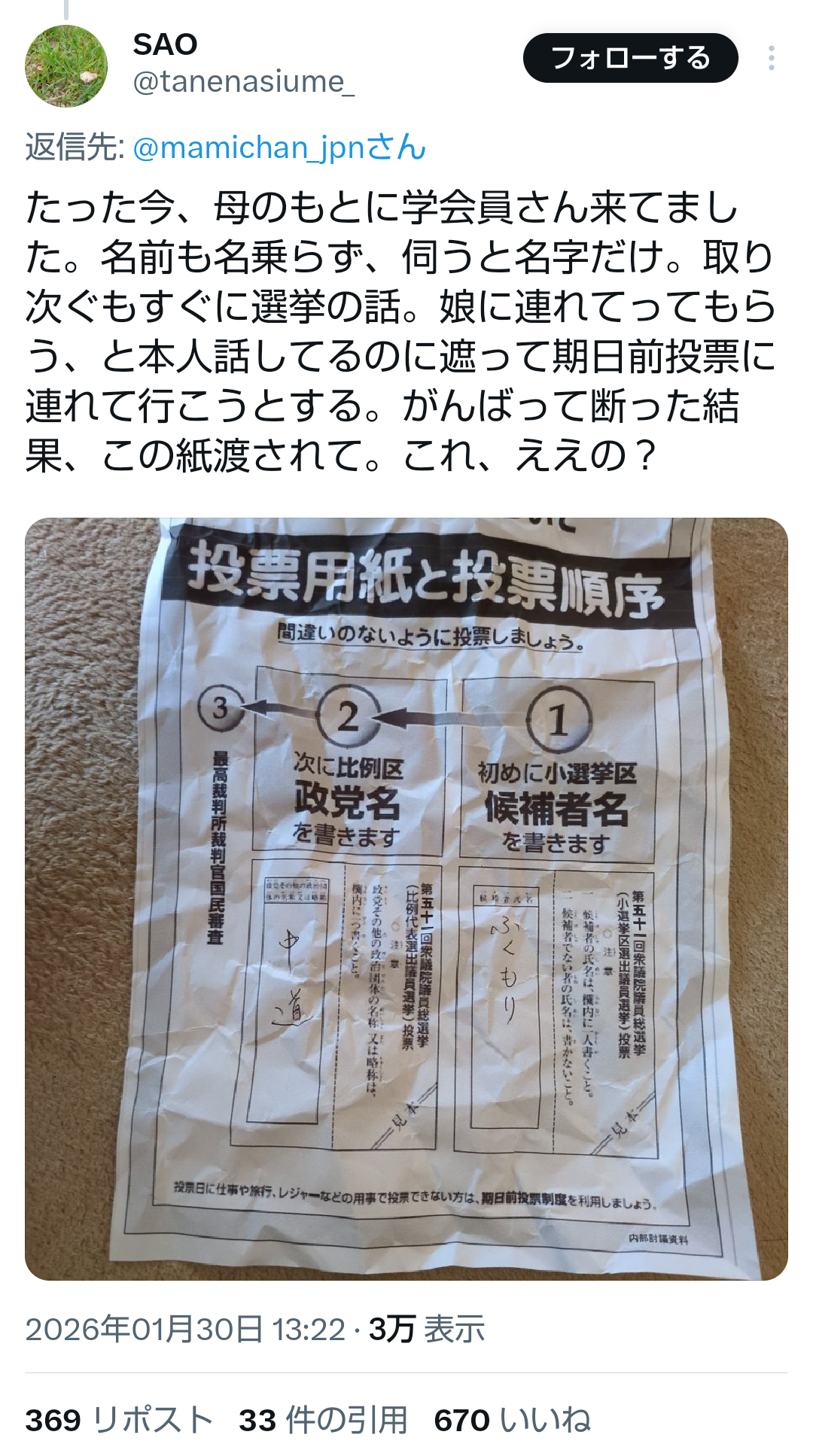 | … | 411無題Name名無し 26/02/01(日)16:10:20No.776123そうだねx1期日前投票に多分学会の老人引率してたくさん並んでたとか言ってるのをXで見たな |