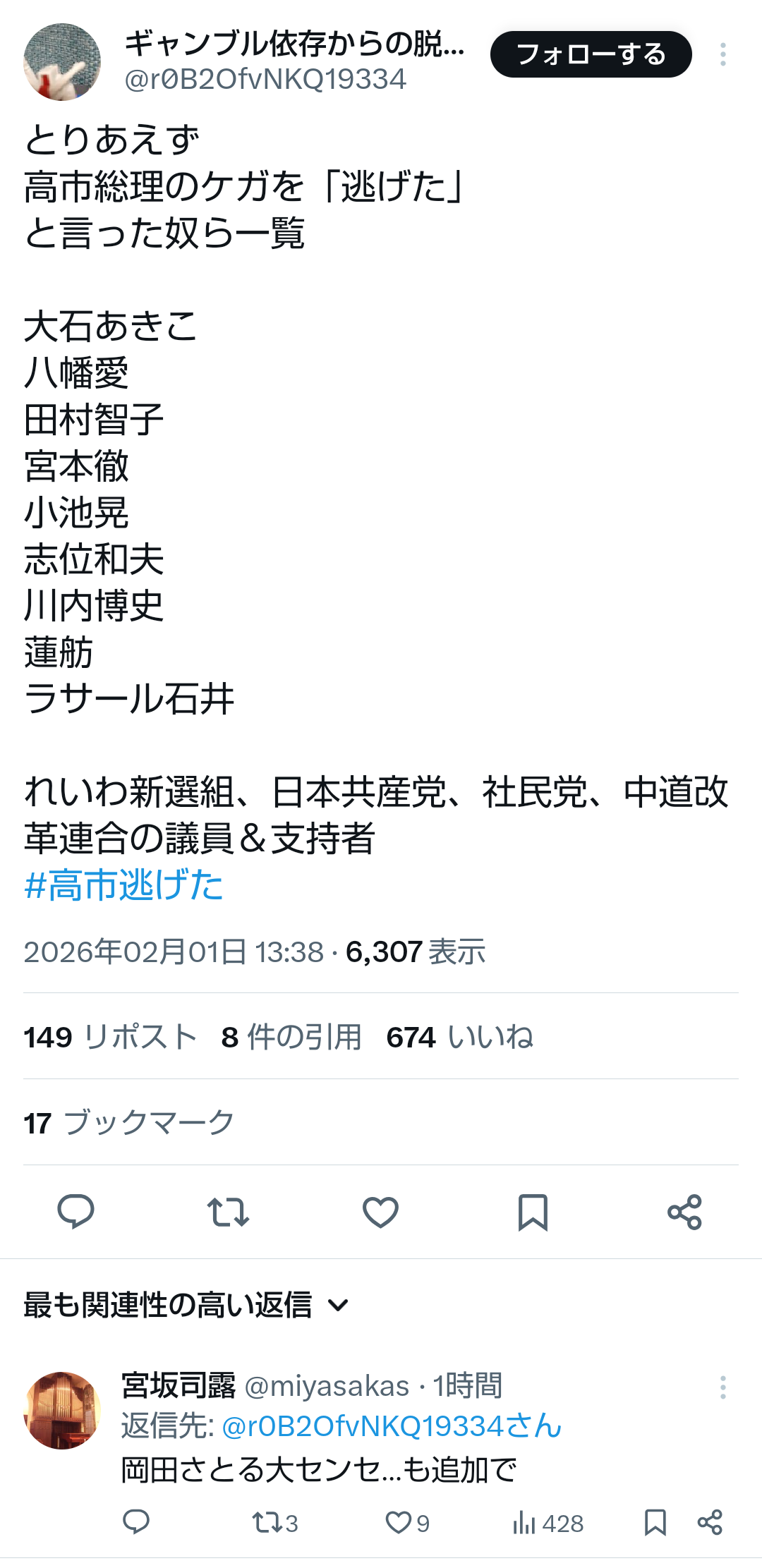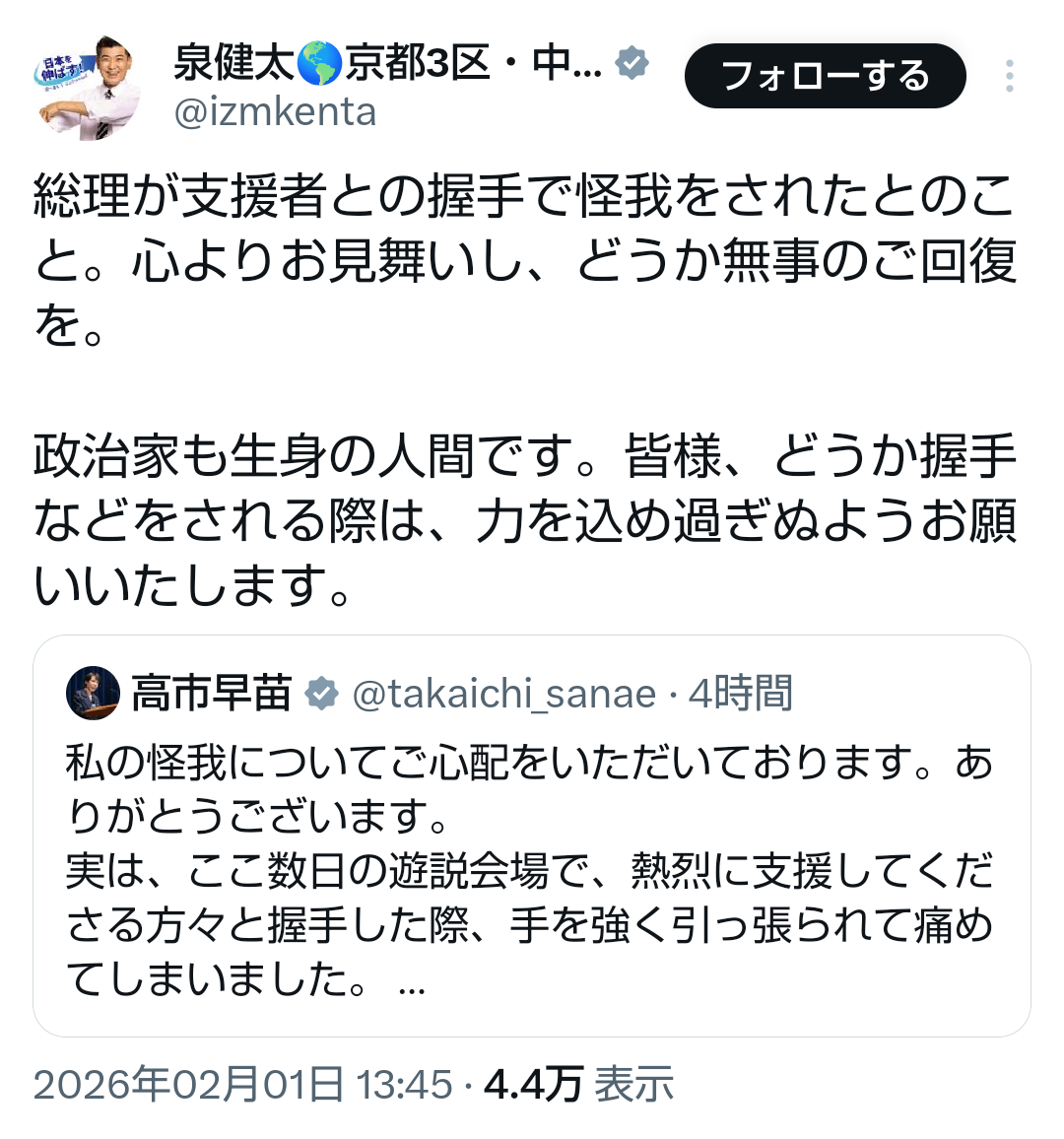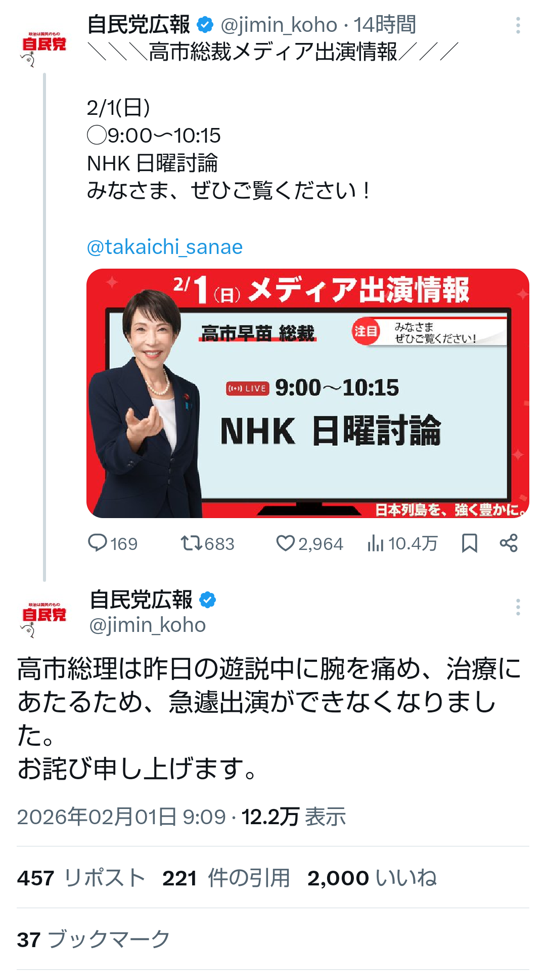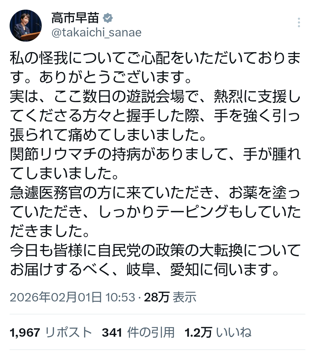 | … | 338無題Name名無し 26/02/01(日)12:33:21No.776039+>自民党と本人が手を負傷して治療のためにお休みってポストしてるんだよな |