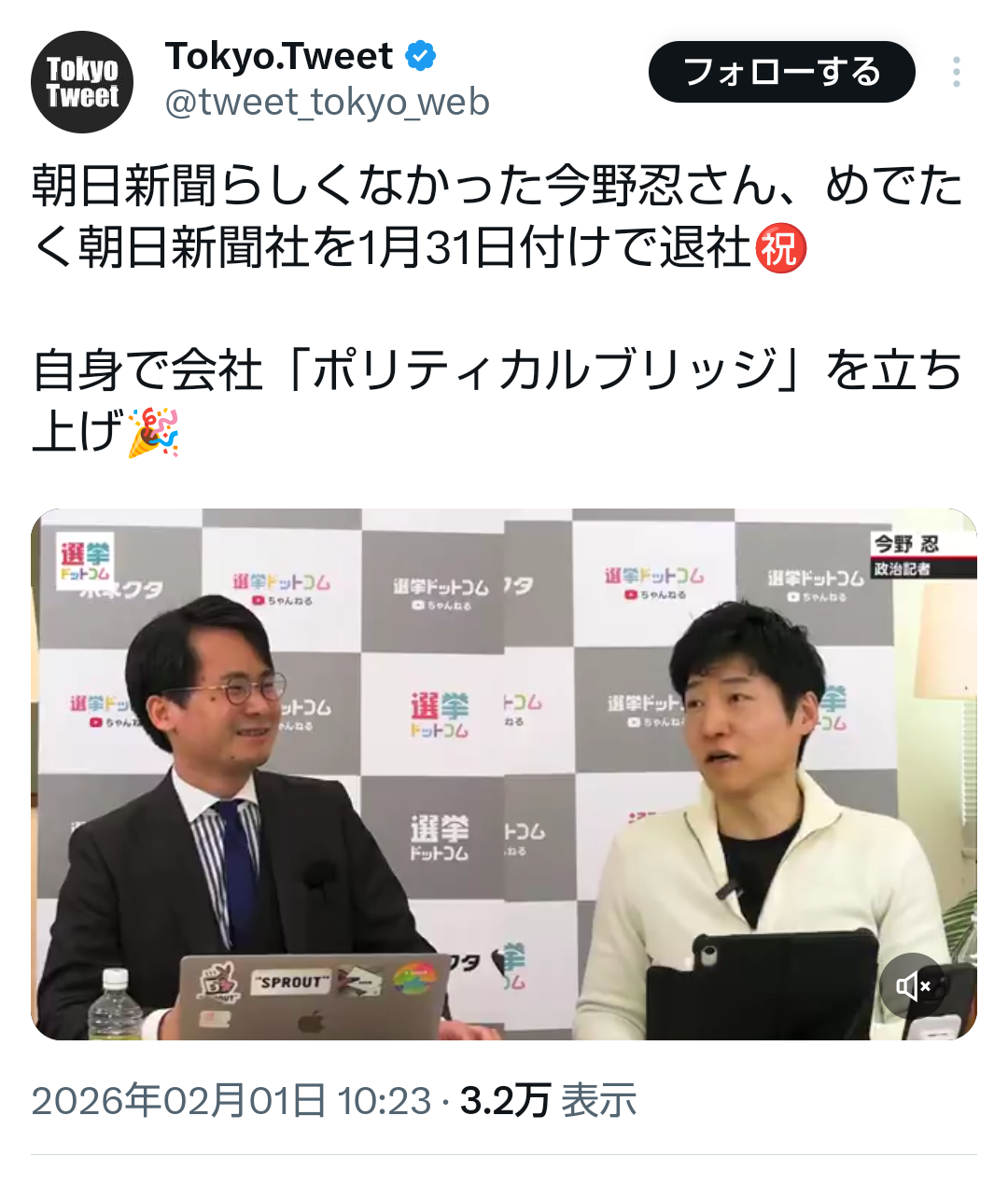 | … | 387無題Name名無し 26/02/01(日)14:50:38No.776096+>朝日新聞の今野さん、朝日やめたんか |