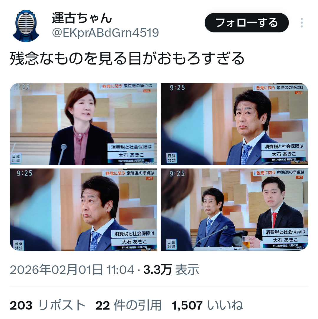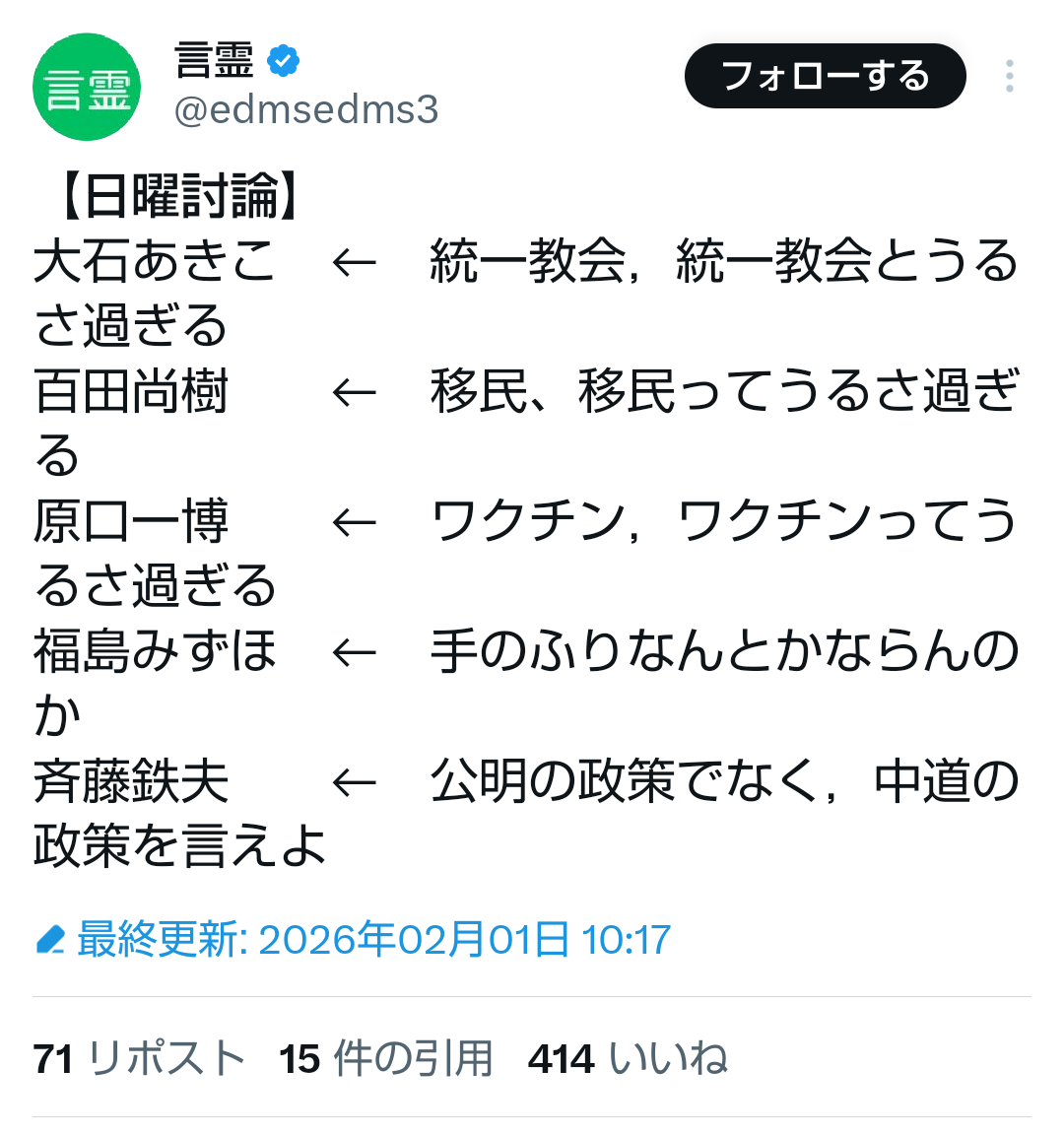 | … | 336無題Name名無し 26/02/01(日)12:31:57No.776037そうだねx1>日曜討論に出なかったかららしい |