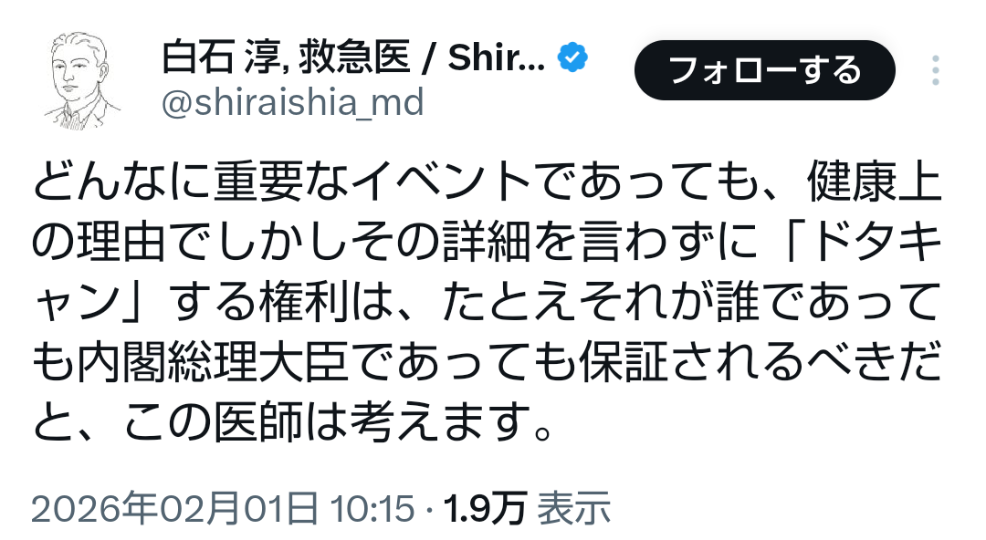 | … | 364無題Name名無し 26/02/01(日)13:31:02No.776069+ 1769920262412.png-(159416 B) >どんなに重要なイベントであっても、健康上の理由でしかしその詳細を言わずに「ドタキャン」する権利は、たとえそれが誰であっても内閣総理大臣であっても保証されるべきだと、この医師は考えます。 |
