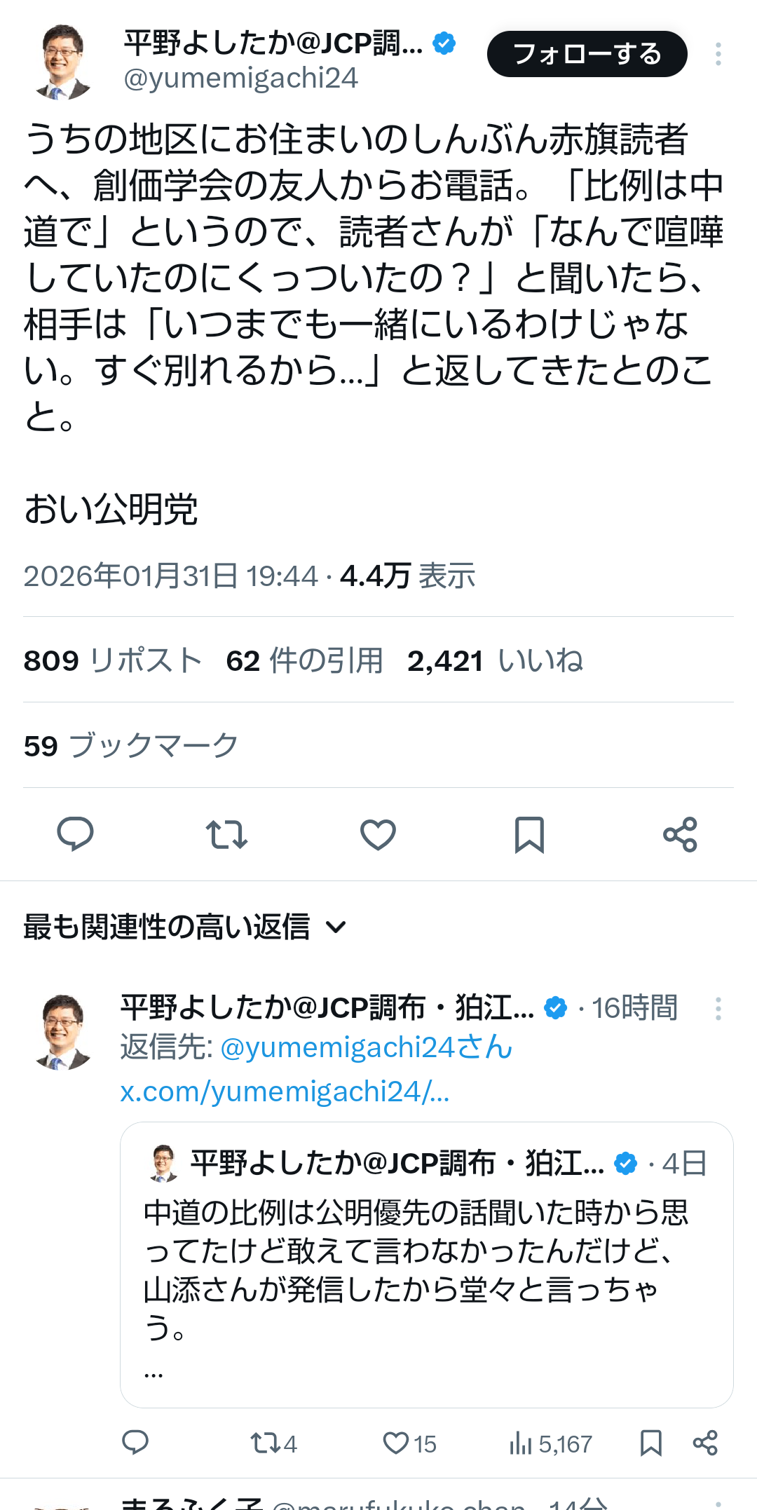 | … | 372無題Name名無し 26/02/01(日)14:13:29No.776080そうだねx1 1769922809367.png-(409551 B) >うちの地区にお住まいのしんぶん赤旗読者へ、創価学会の友人からお電話。「比例は中道で」というので、読者さんが「なんで喧嘩していたのにくっついたの?」と聞いたら、相手は「いつまでも一緒にいるわけじゃない。すぐ別れるから…」と返してきたとのこと。 |