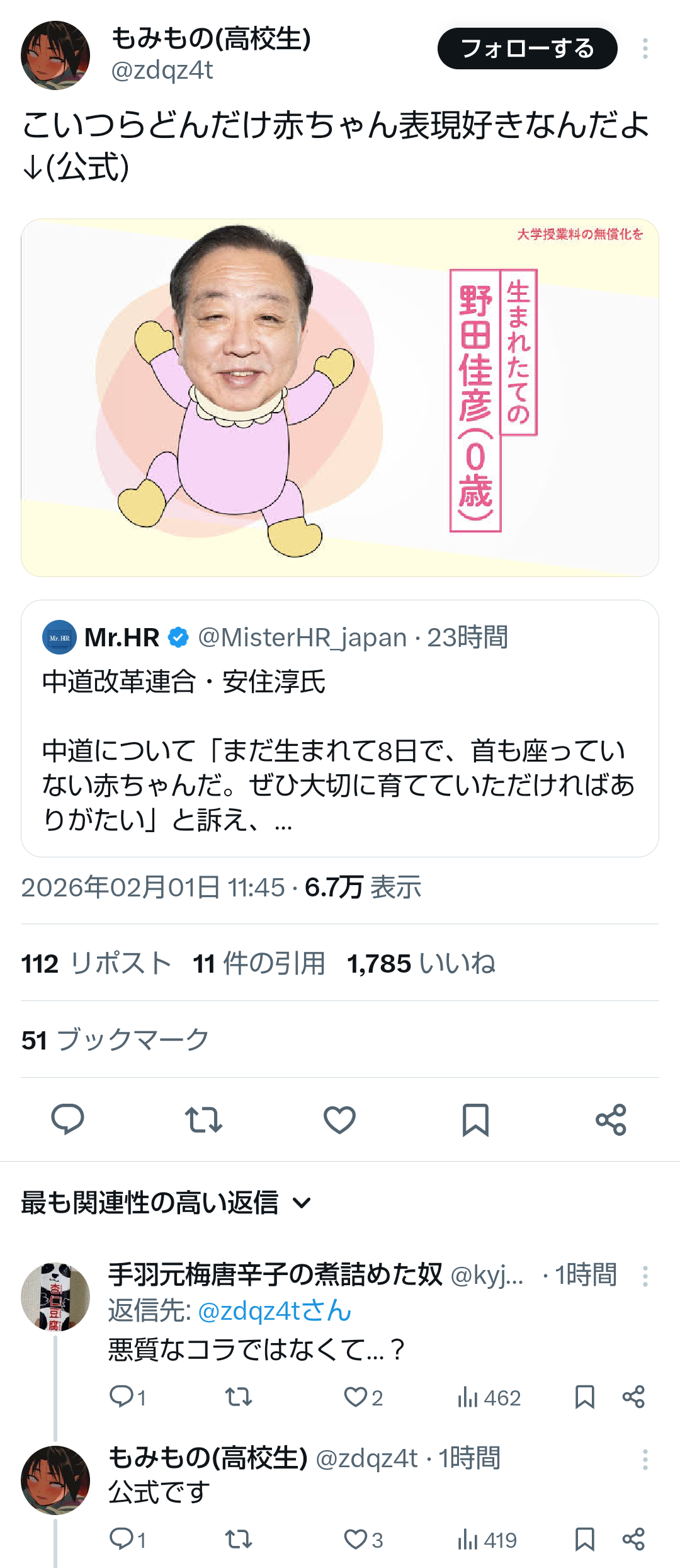 | … | 423無題Name名無し 26/02/01(日)17:29:14No.776143+踊る赤ちゃん人間をリアルで政治家がやってんのやべえわ |