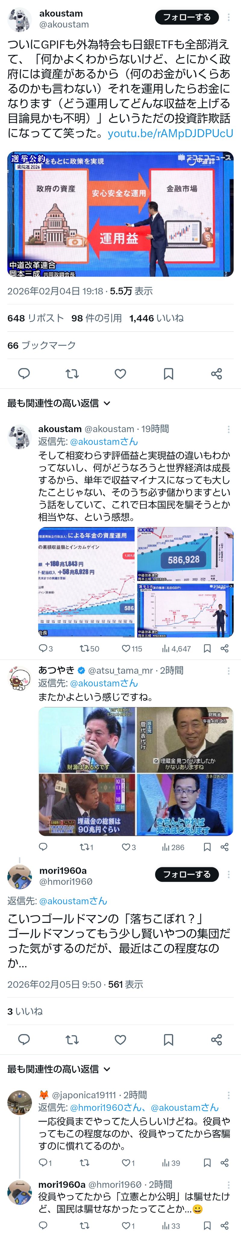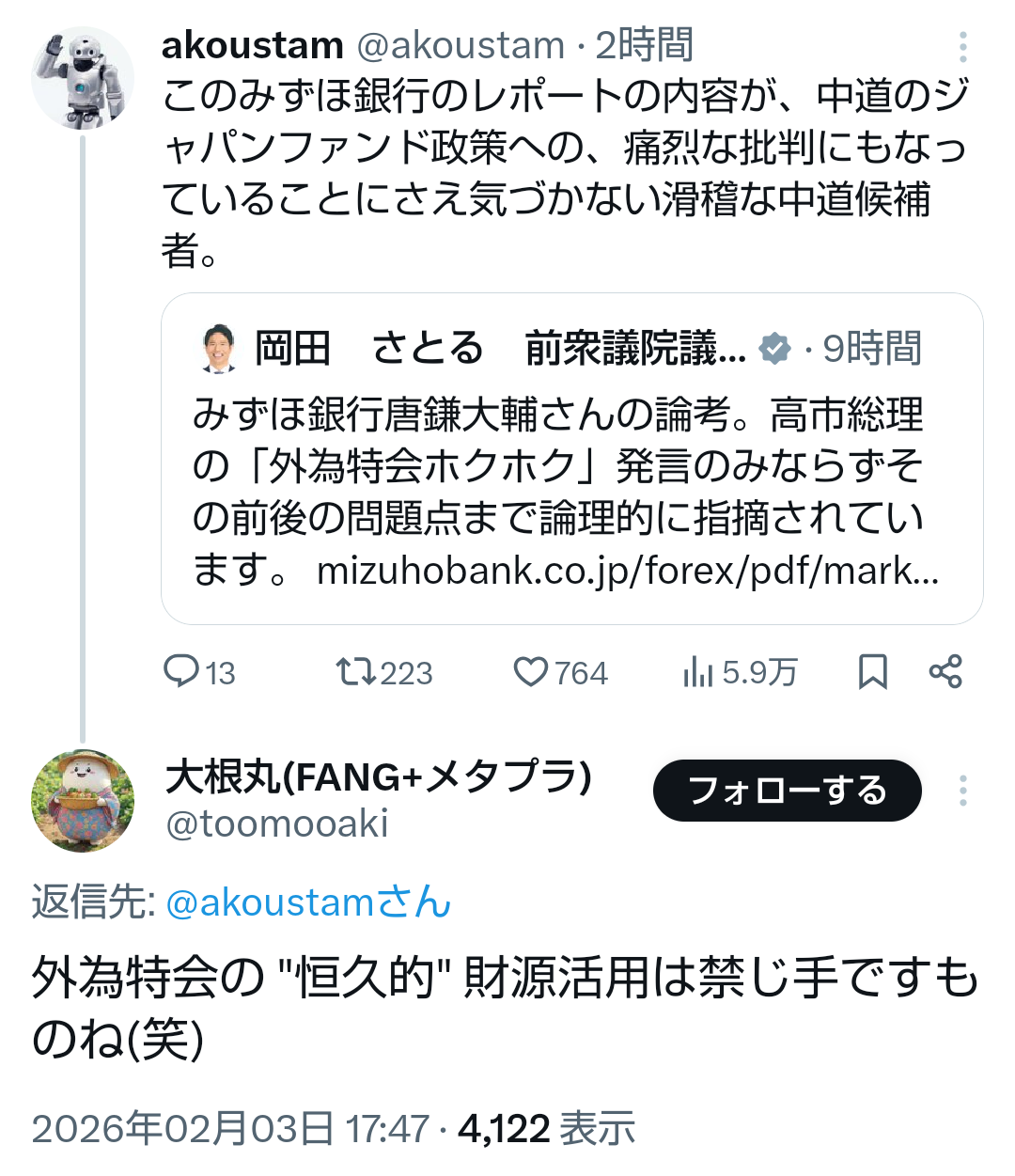 | … | 7無題Name名無し 26/02/03(火)20:06:36No.776843そうだねx6 1770116796727.png-(318076 B) >このみずほ銀行のレポートの内容が、中道のジャパンファンド政策への、痛烈な批判にもなっていることにさえ気づかない滑稽な中道候補者。 |