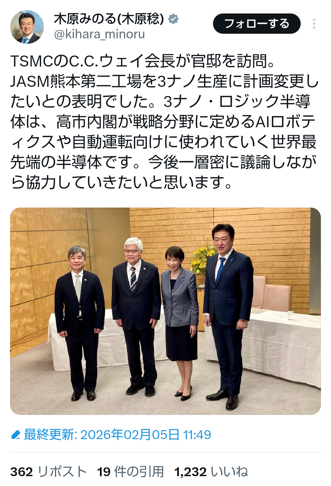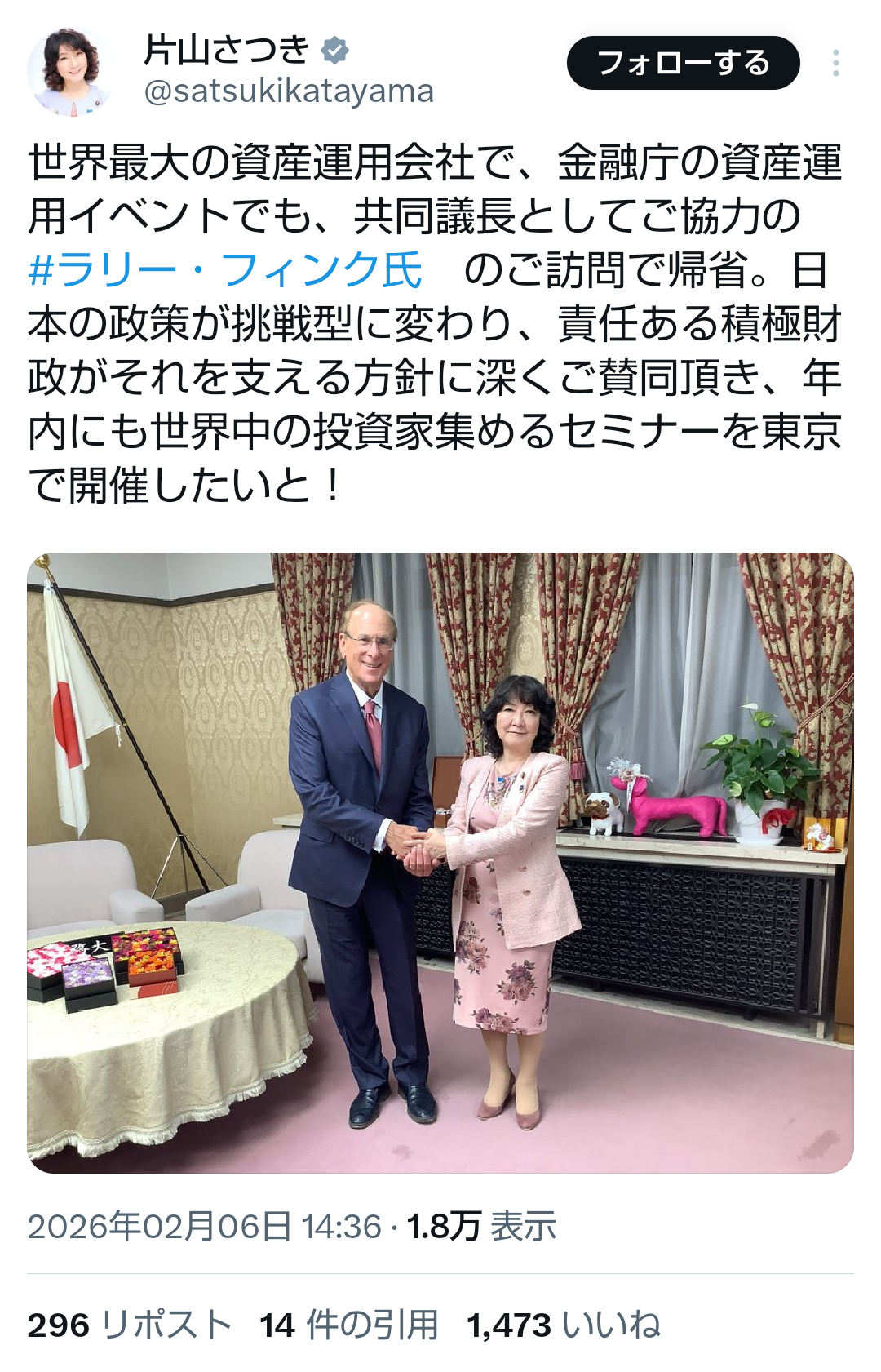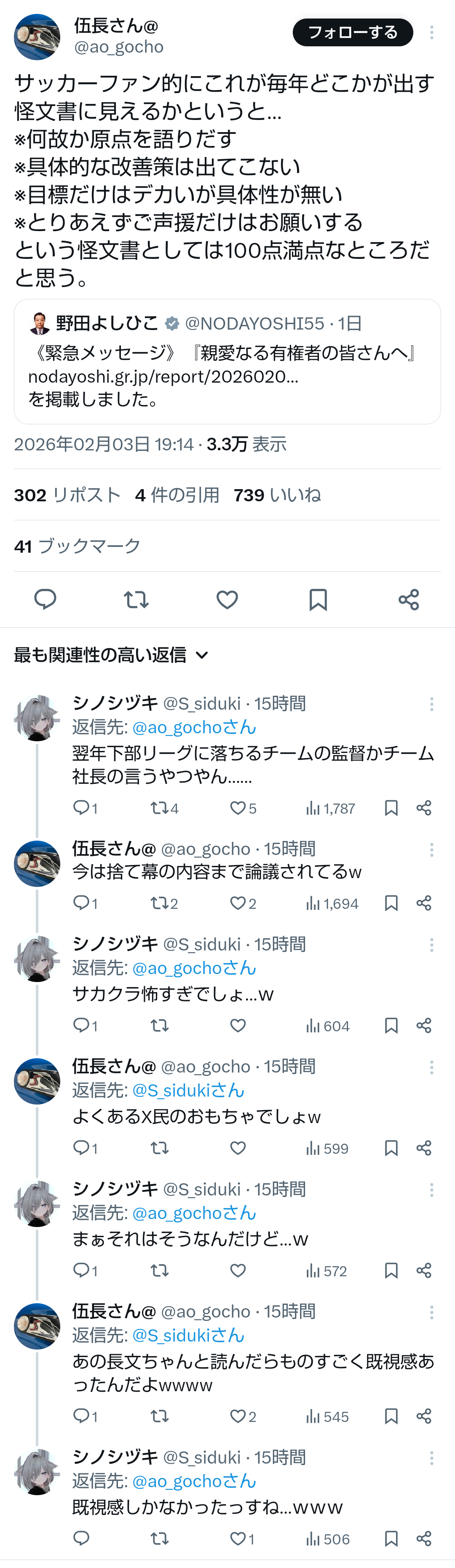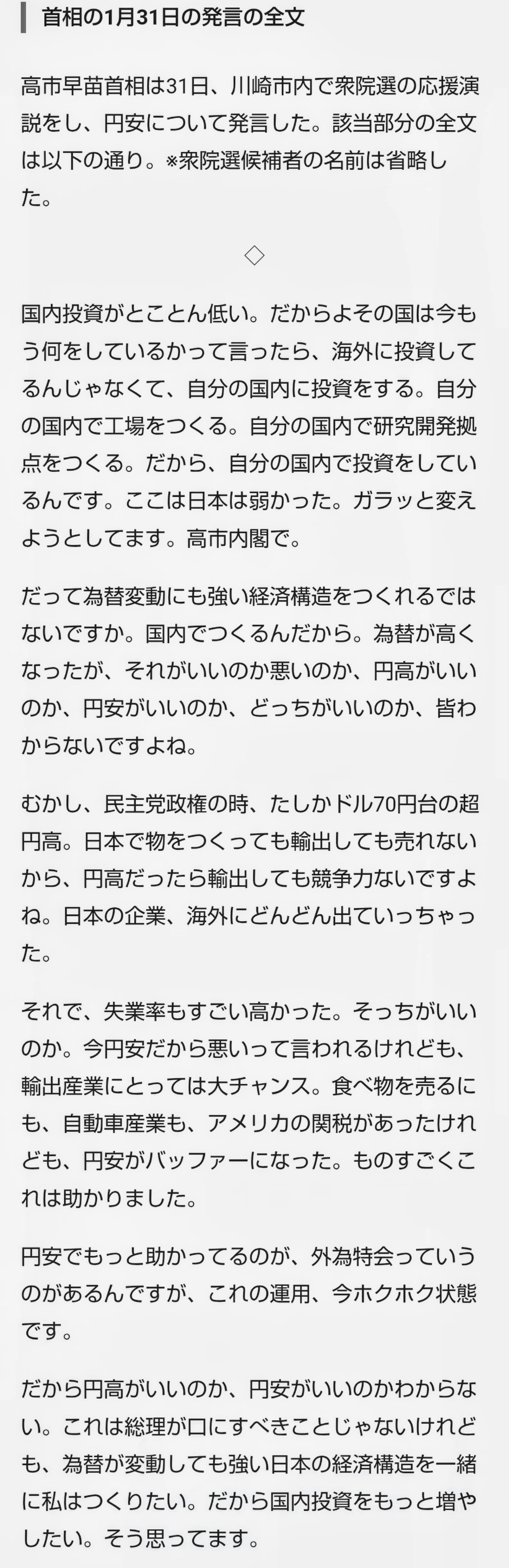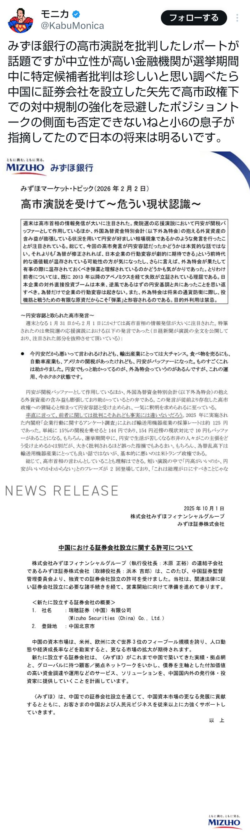 | … | 16無題Name名無し 26/02/03(火)20:57:41No.776852そうだねx6 1770119861431.jpg-(368589 B) >みずほ銀行の高市演説を批判したレポートが話題ですが中立性が高い金融機関が選挙期間中に特定候補者批判は珍しいと思い調べたら中国に証券会社を設立した矢先で高市政権下での対中規制の強化を忌避したポジショントークの側面も否定できないねと小6の息子が指摘してたので日本の将来は明るいです。 |