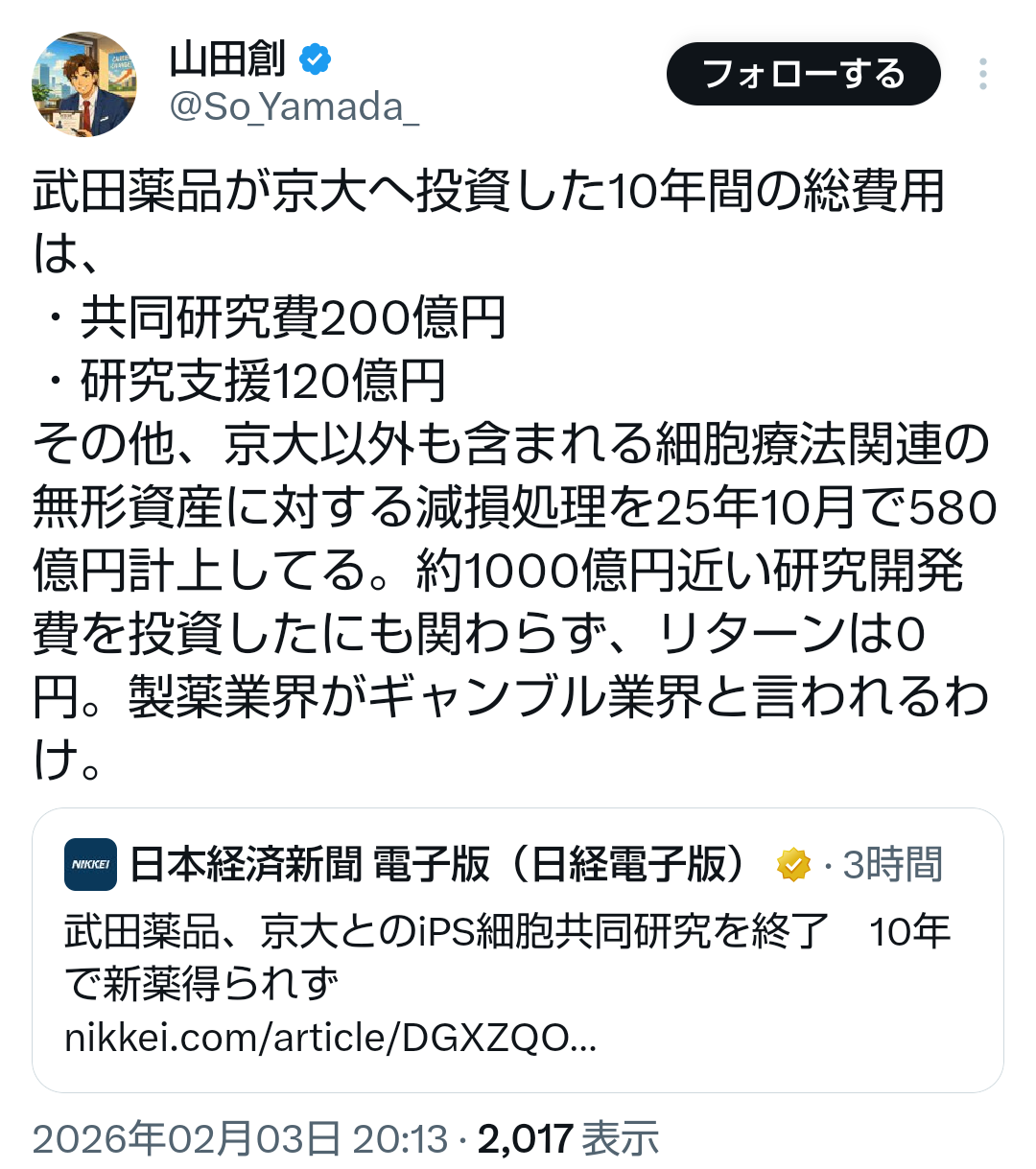 | … | 22無題Name名無し 26/02/03(火)21:30:57No.776862そうだねx1 1770121857298.png-(298018 B) >武田薬品、京大とのiPS細胞共同研究を終了 10年で新薬得られず |