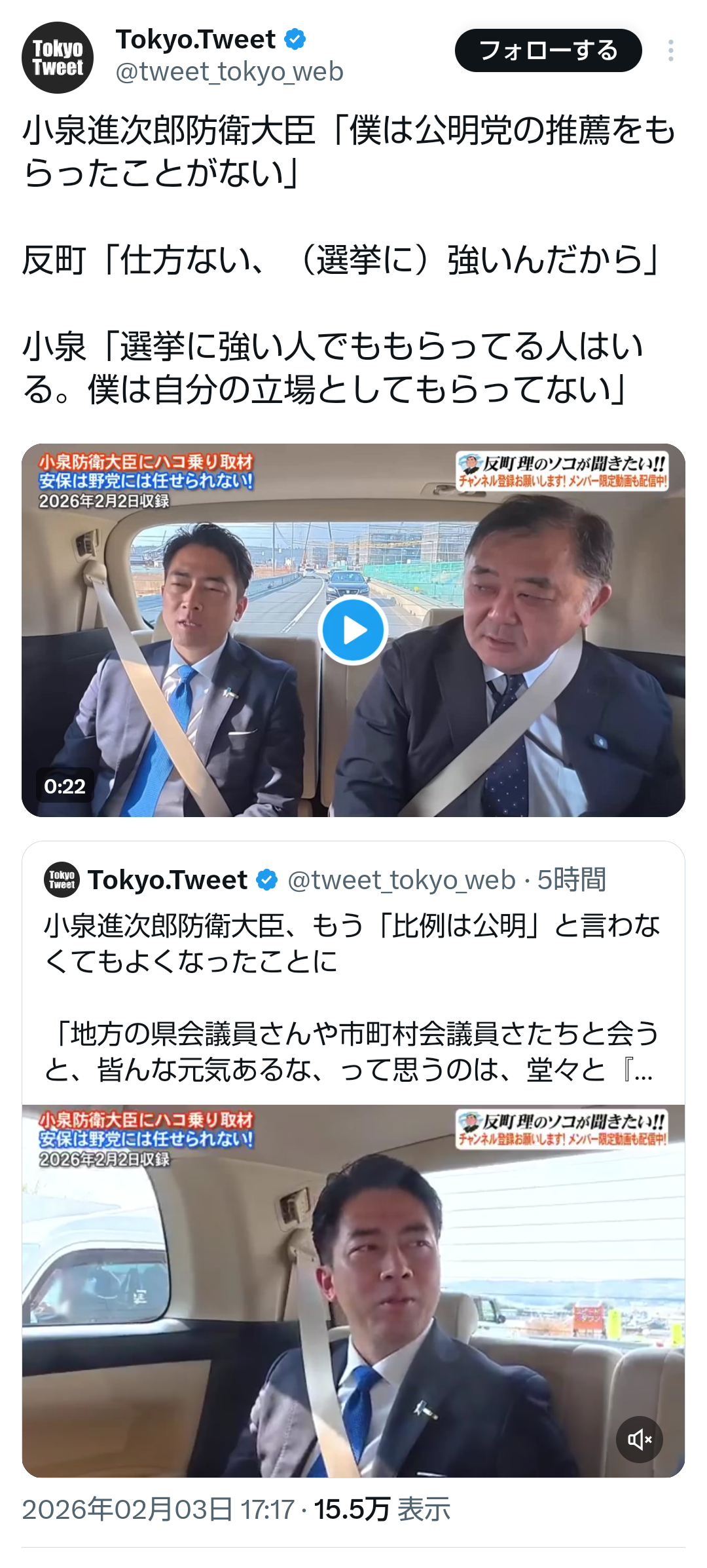 | … | 35無題Name名無し 26/02/03(火)21:59:27No.776879+ 1770123567677.png-(1498113 B) >小泉進次郎防衛大臣「僕は公明党の推薦をもらったことがない」 |