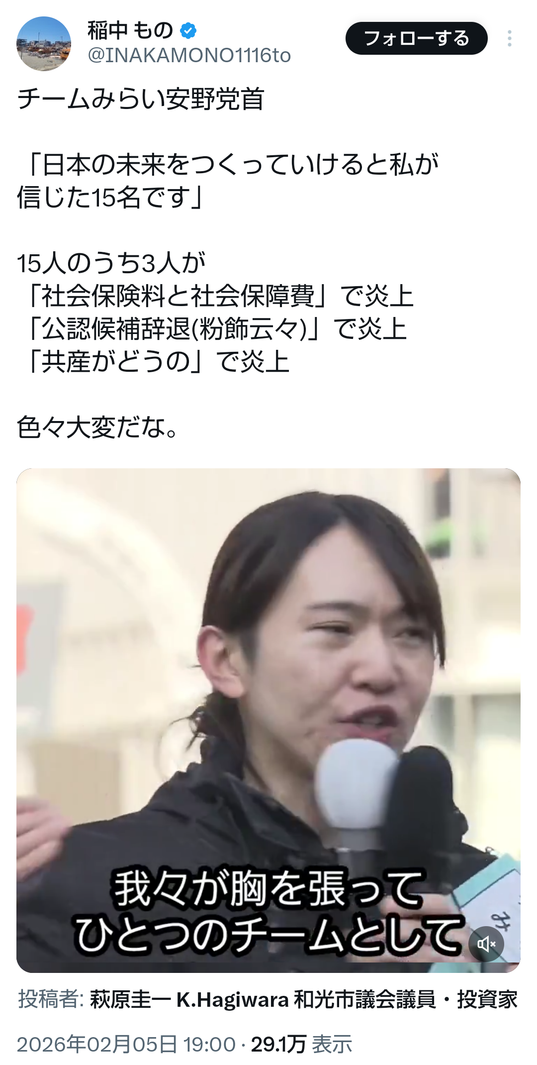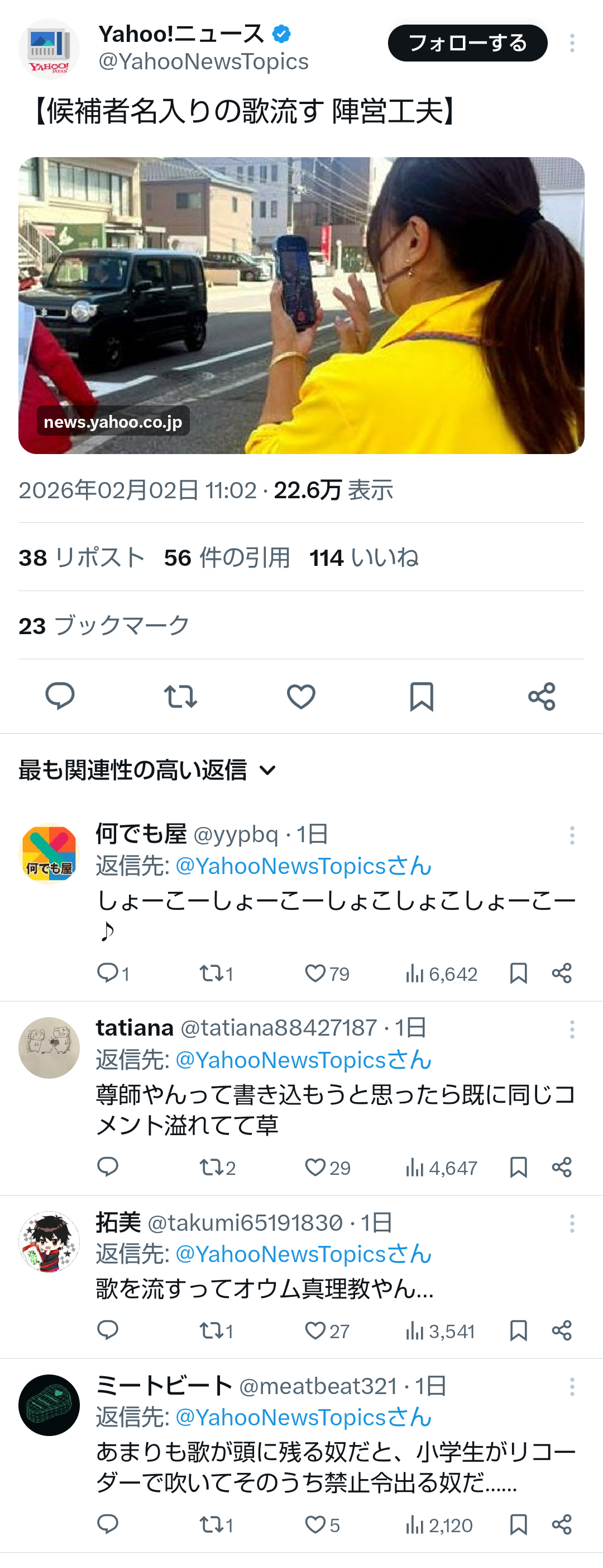 | … | 70無題Name名無し 26/02/03(火)23:44:31No.776914そうだねx5 1770129871385.mp4-(2724068 B) >【候補者名入りの歌流す 陣営工夫】 |