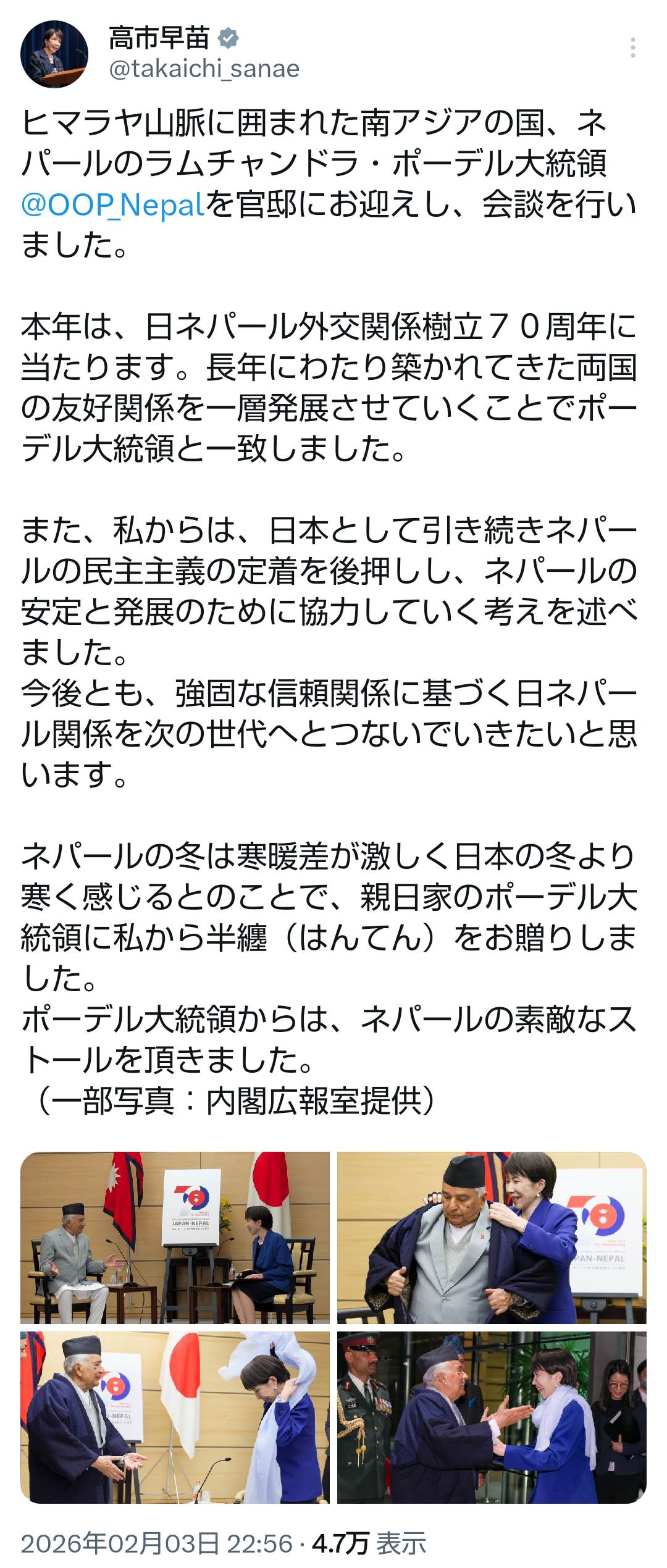 | … | 67無題Name名無し 26/02/03(火)23:24:26No.776911+ 1770128666753.png-(1309789 B) >ヒマラヤ山脈に囲まれた南アジアの国、ネパールのラムチャンドラ・ポーデル大統領@OOP_Nepalを官邸にお迎えし、会談を行いました。 |
