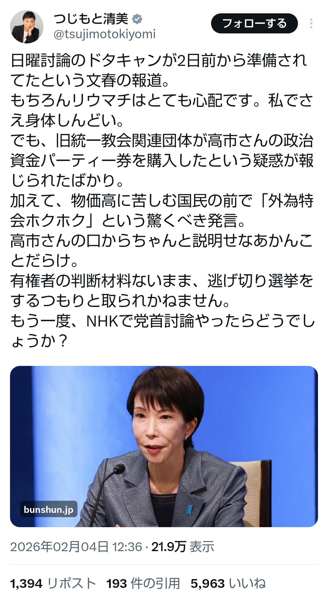 | … | 75無題Name名無し 26/02/04(水)00:10:37No.776919そうだねx1>>《衝撃スクープ》高市首相がNHK「日曜討論」出演キャンセルを2日前から準備していた! | 文春オンライン |