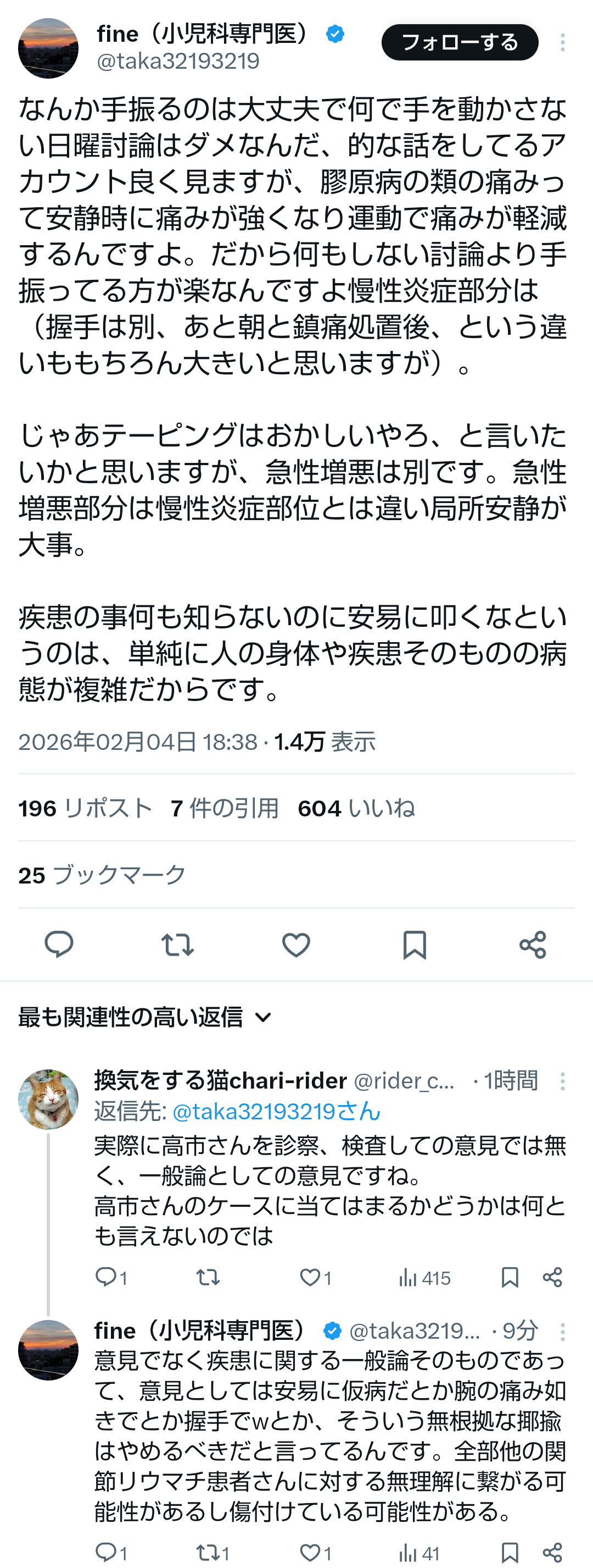 | … | 45無題Name名無し 26/02/03(火)22:11:34No.776889そうだねx7>怪我を理由にキャンセルした事を擁護した人とかリウマチ患者で共感持った人が反転アンチになりそうな展開 |