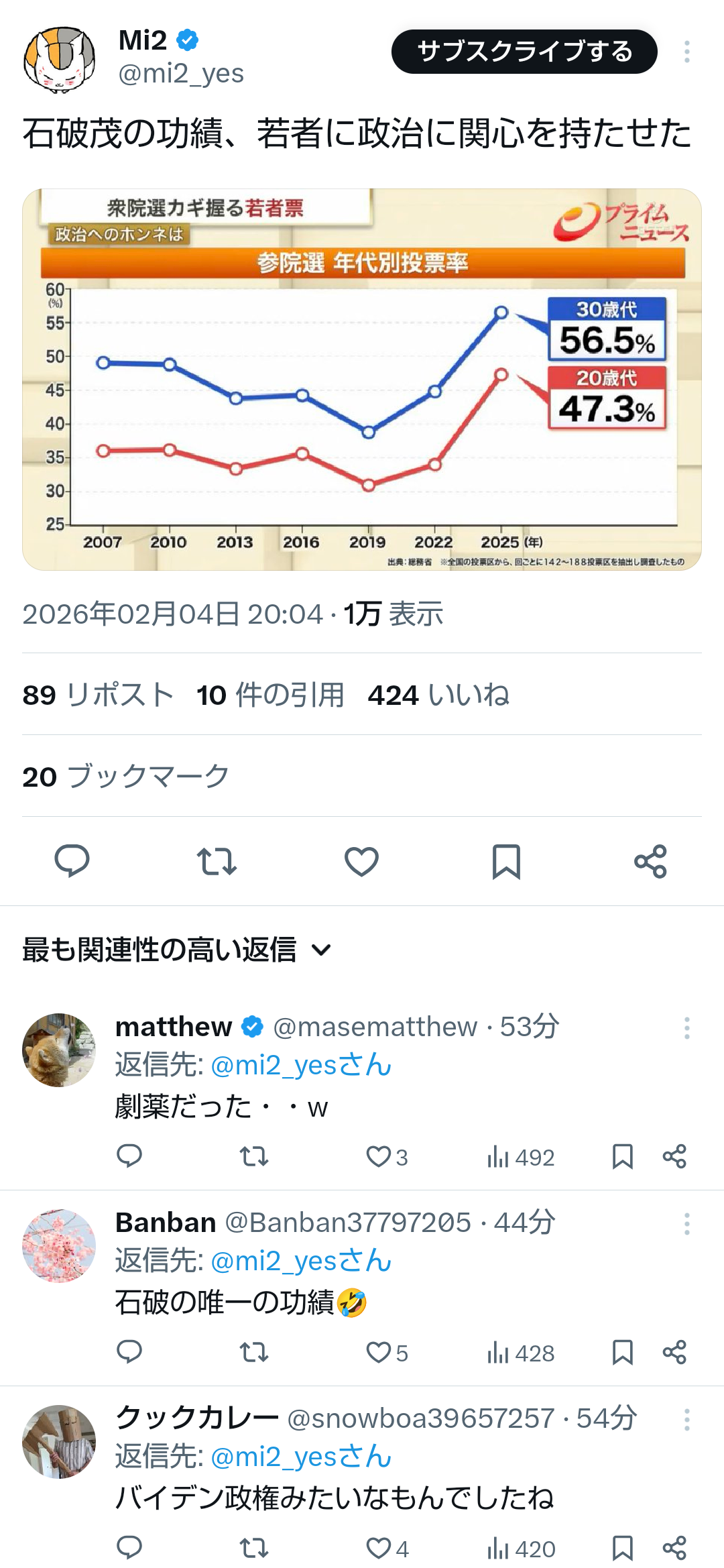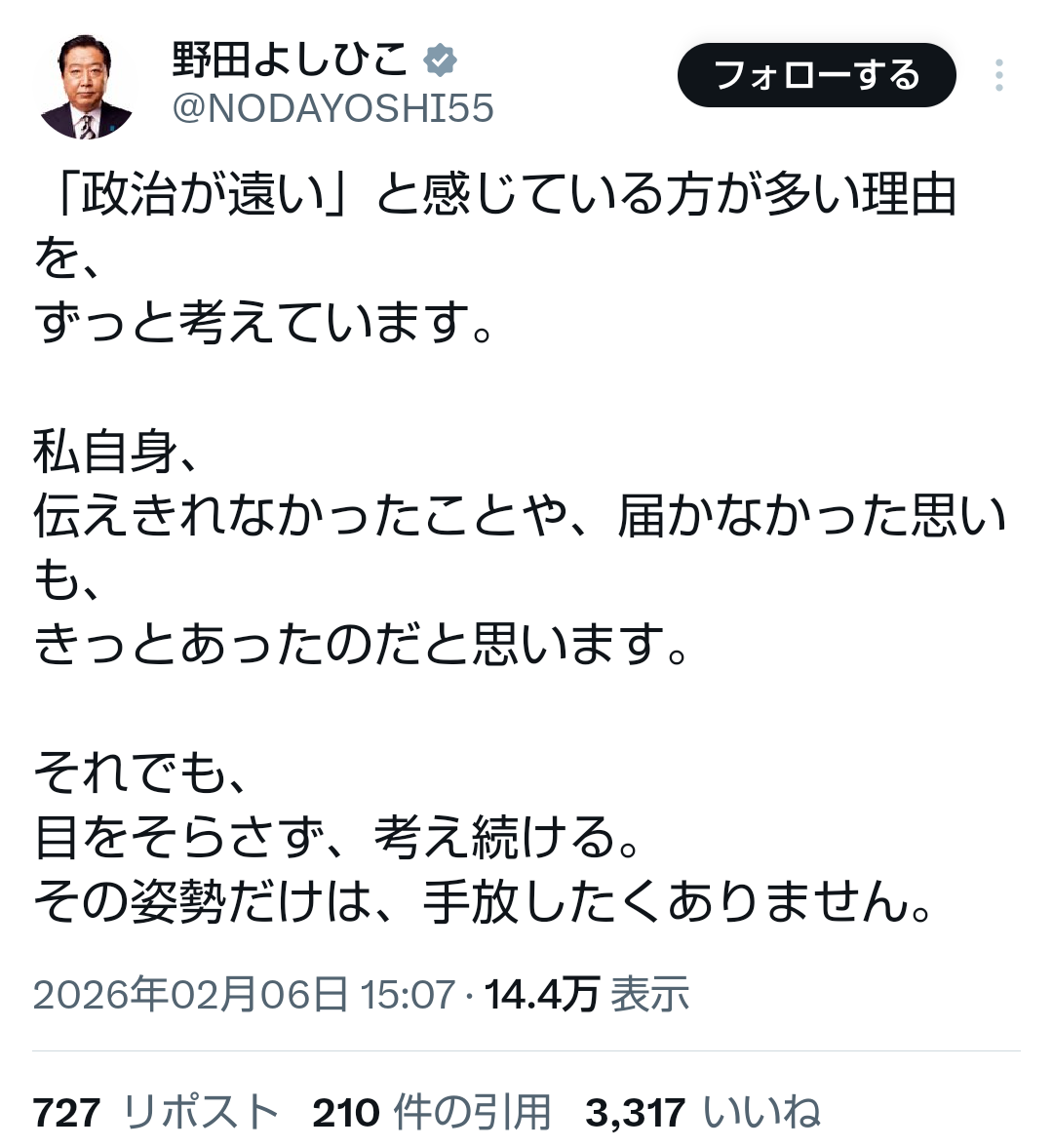| … | 633無題Name名無し 26/02/06(金)17:04:05No.777607+ 1770365045995.png-(200791 B) >「政治が遠い」と感じている方が多い理由を、ずっと考えています。 |