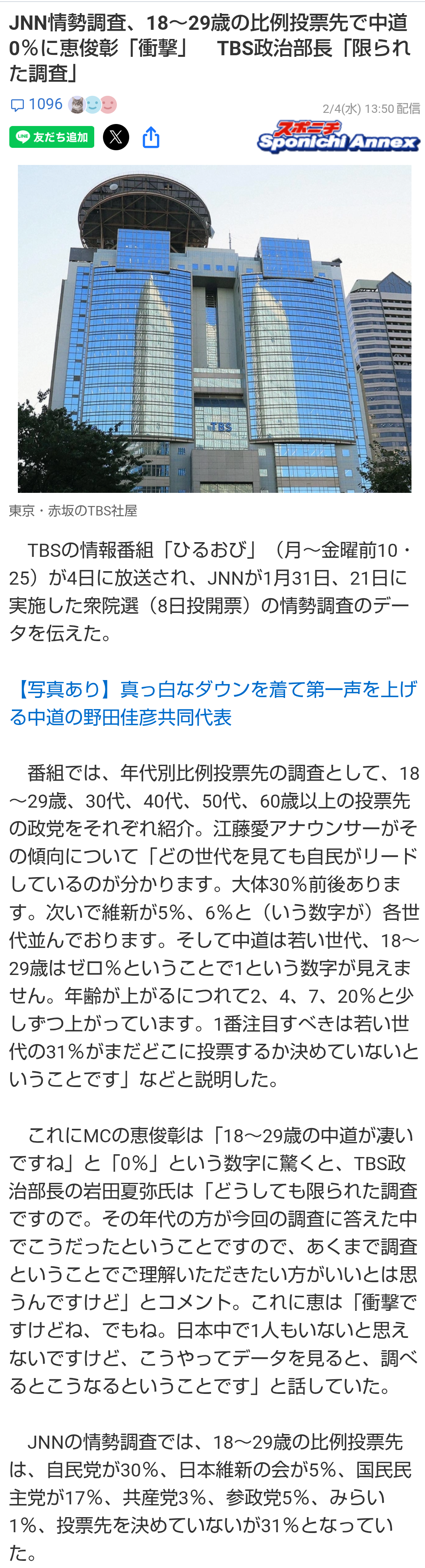 | … | 697無題Name名無し 26/02/06(金)20:01:04No.777672+JNNの情勢調査で18〜29歳の中道支持率0%っていうやべえ数字が出てたからな |