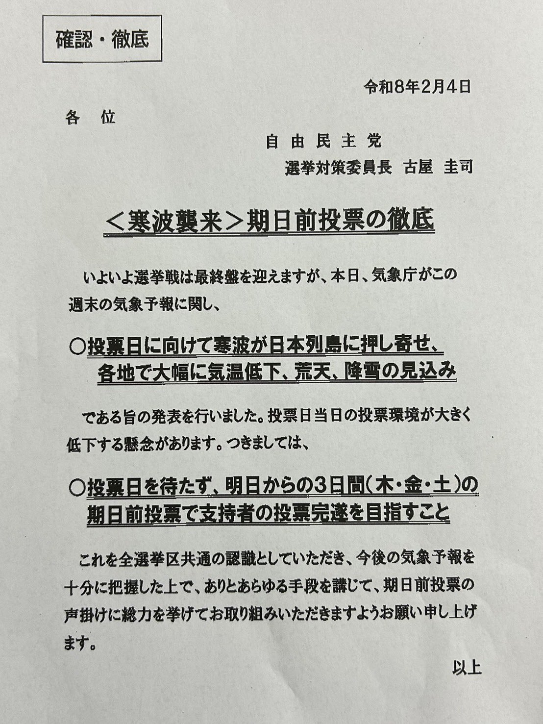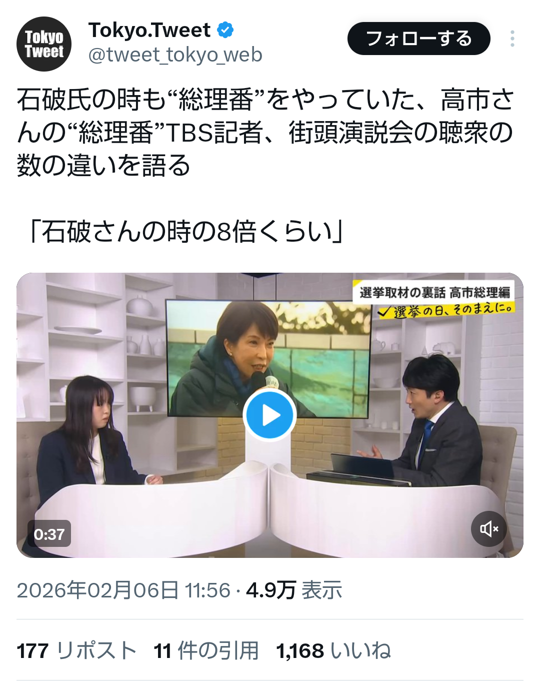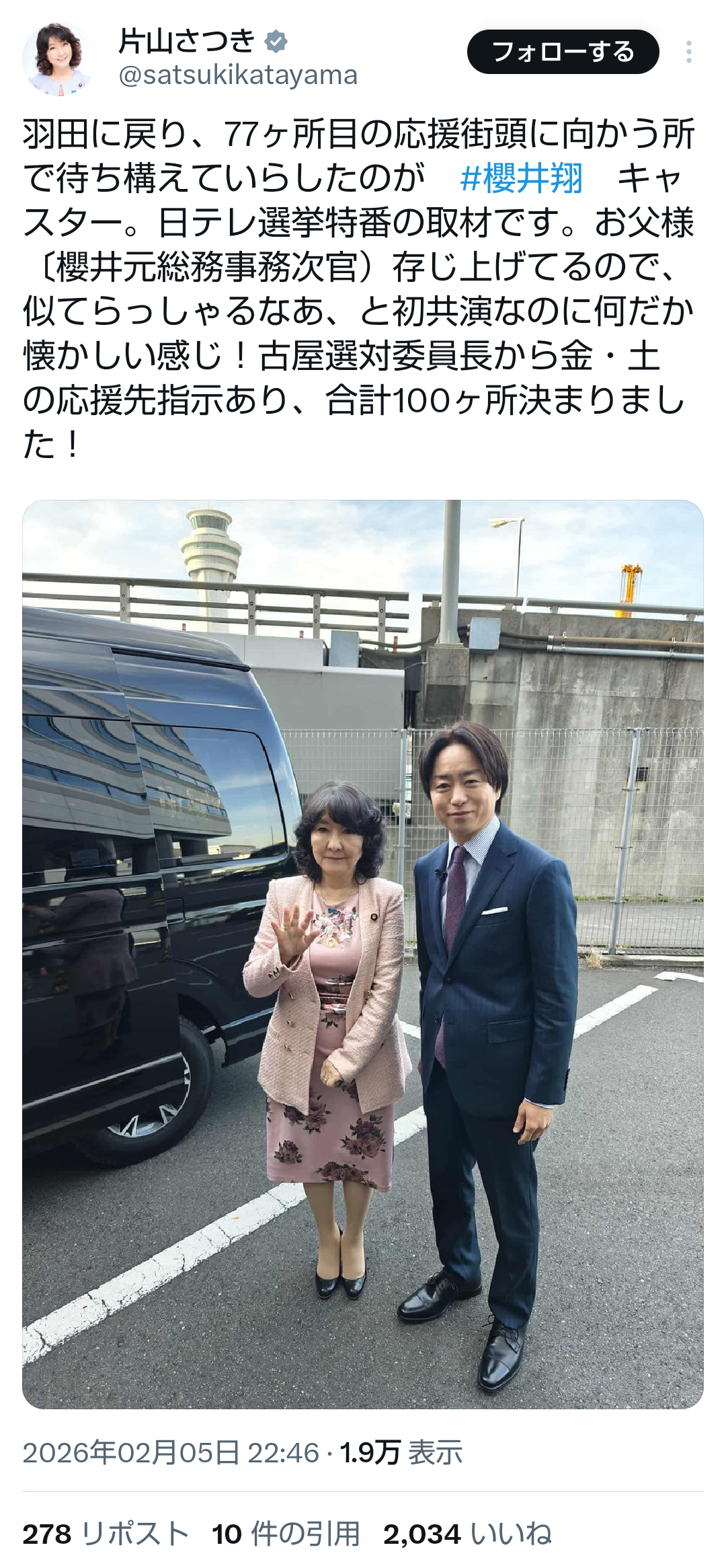 | … | 624無題Name名無し 26/02/06(金)15:57:21No.777598+ 1770361041483.png-(1275936 B) >>羽田に戻り、77ヶ所目の応援街頭に向かう所で待ち構えていらしたのが #櫻井翔 キャスター。日テレ選挙特番の取材です。お父様〔櫻井元総務事務次官)存じ上げてるので、似てらっしゃるなあ、と初共演なのに何だか懐かしい感じ!古屋選対委員長から金・土の応援先指示あり、合計100ヶ所決まりました! |