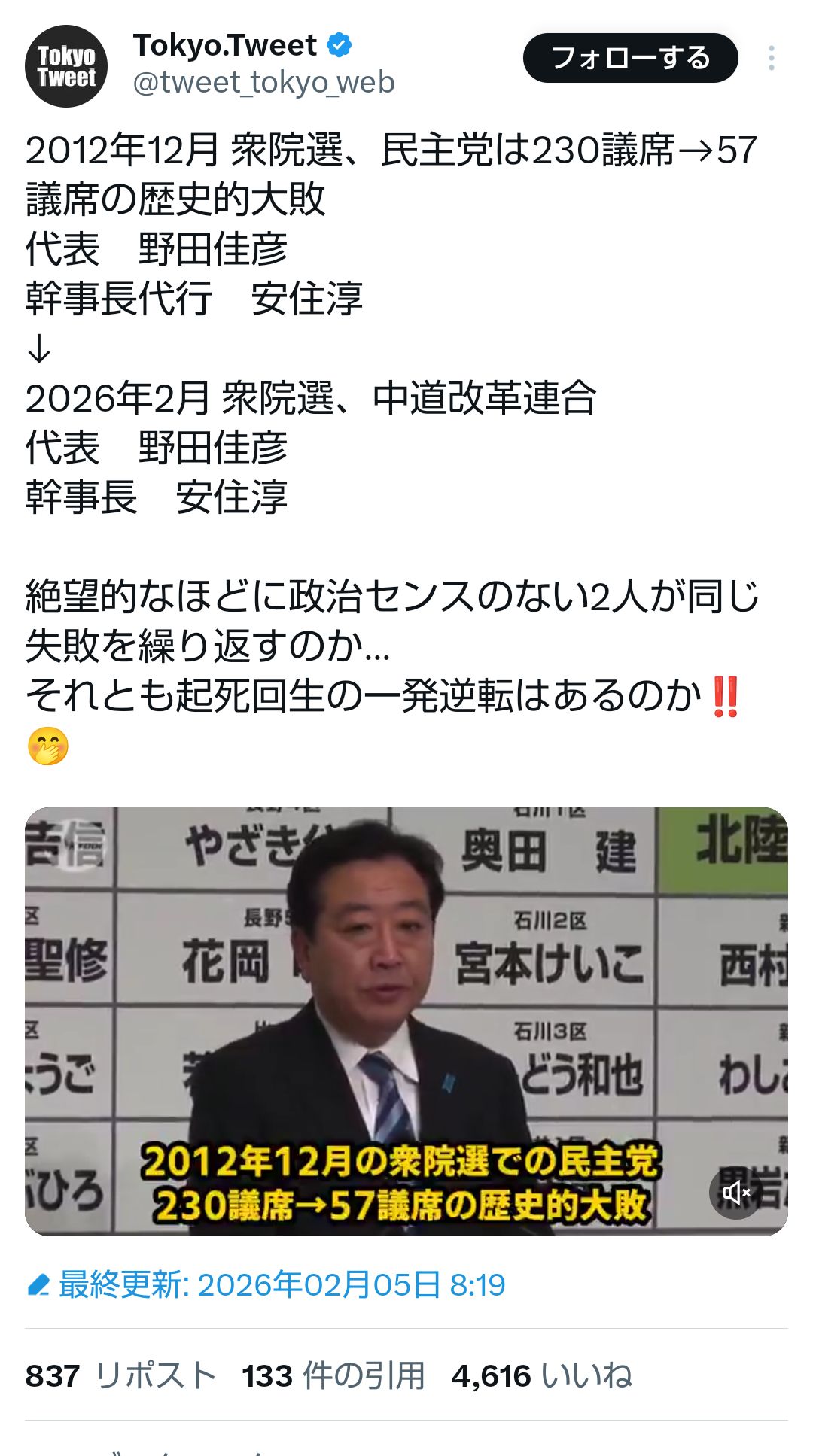 | … | 41無題Name名無し 26/02/03(火)22:06:21No.776885そうだねx1 1770123981682.jpg-(536239 B) 野田が言ってることは言ってない |