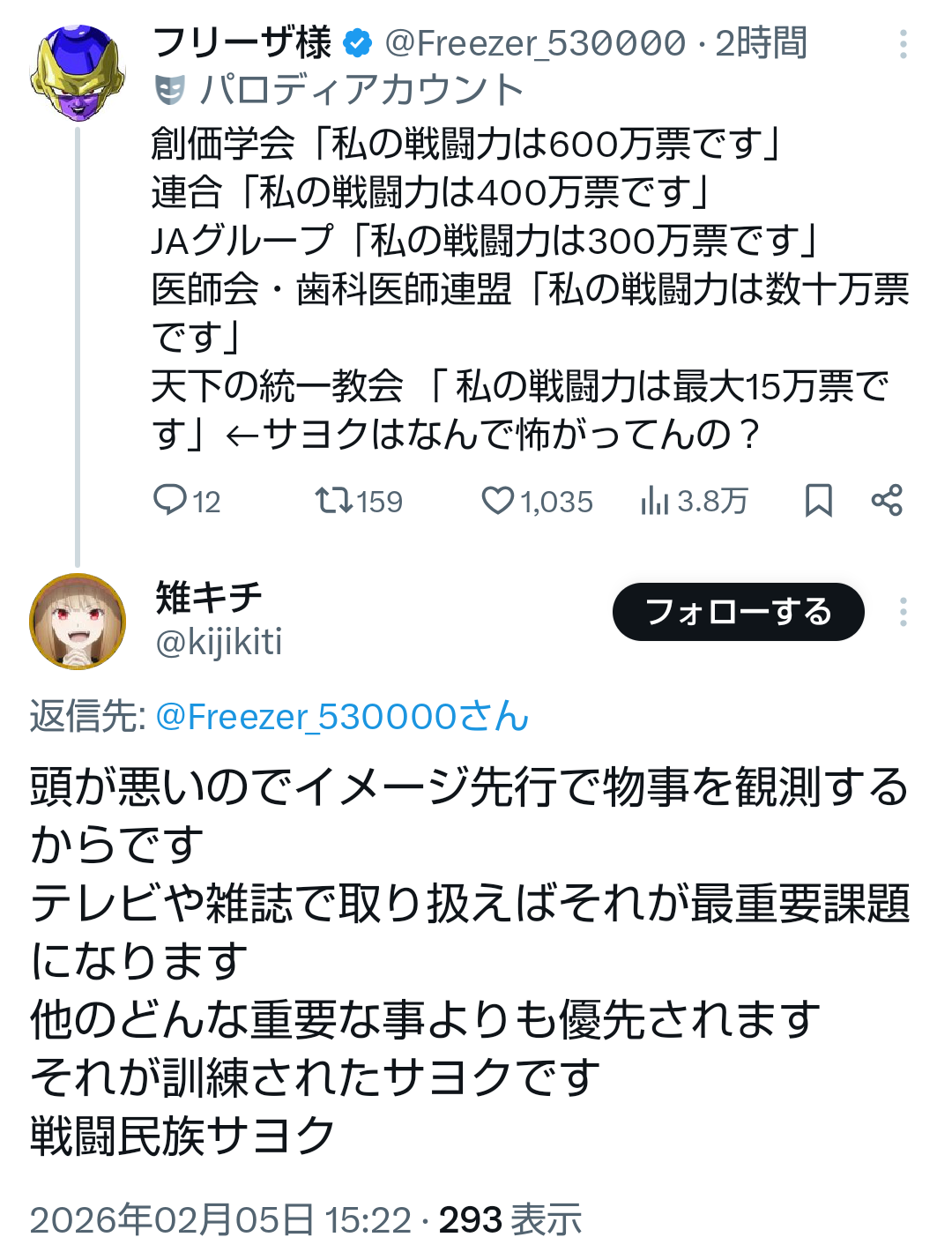 | … | 57無題Name名無し 26/02/03(火)22:37:00No.776901+中革連の主要な支持層は政策も何も関係ない学会員とヤフコメですら距離が遠い反自民高齢層だろうから |