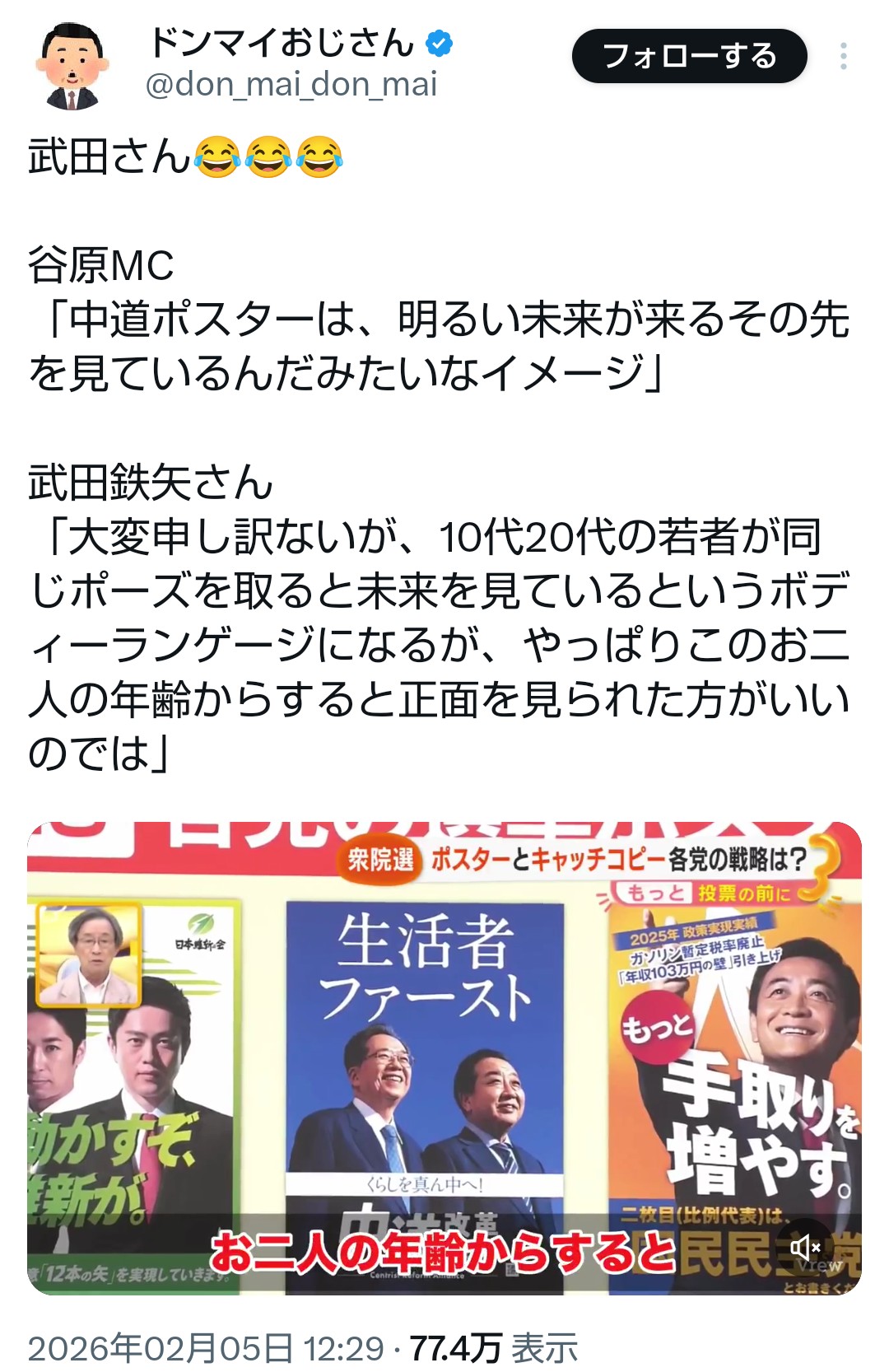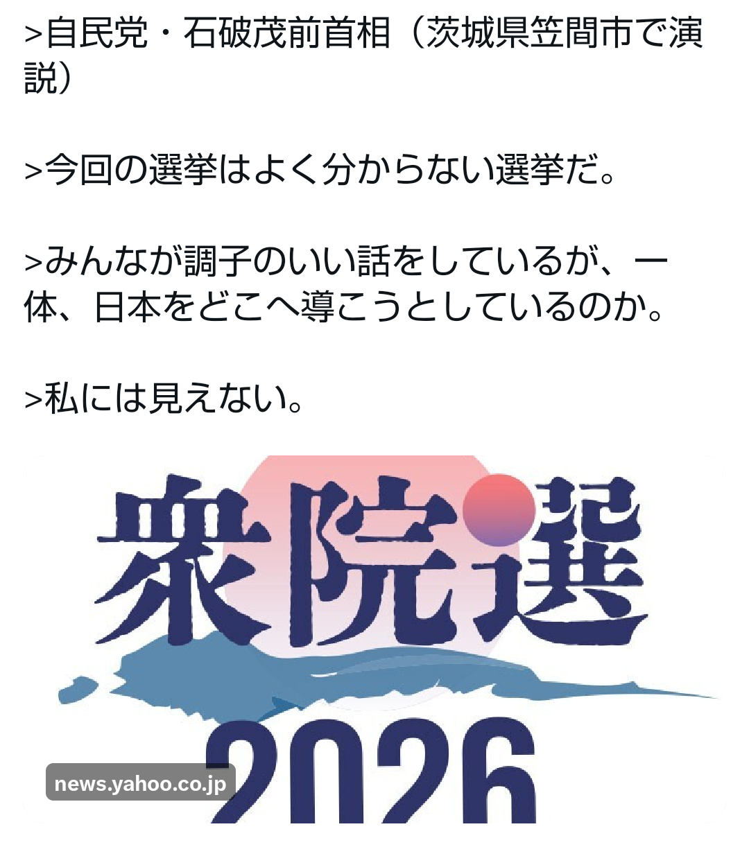 | … | 634無題Name名無し 26/02/06(金)17:14:15No.777608+ 1770365655998.png-(379075 B) >よく分からない選挙 自民党・石破茂前首相(4日)【舌戦・2026衆院選】 |