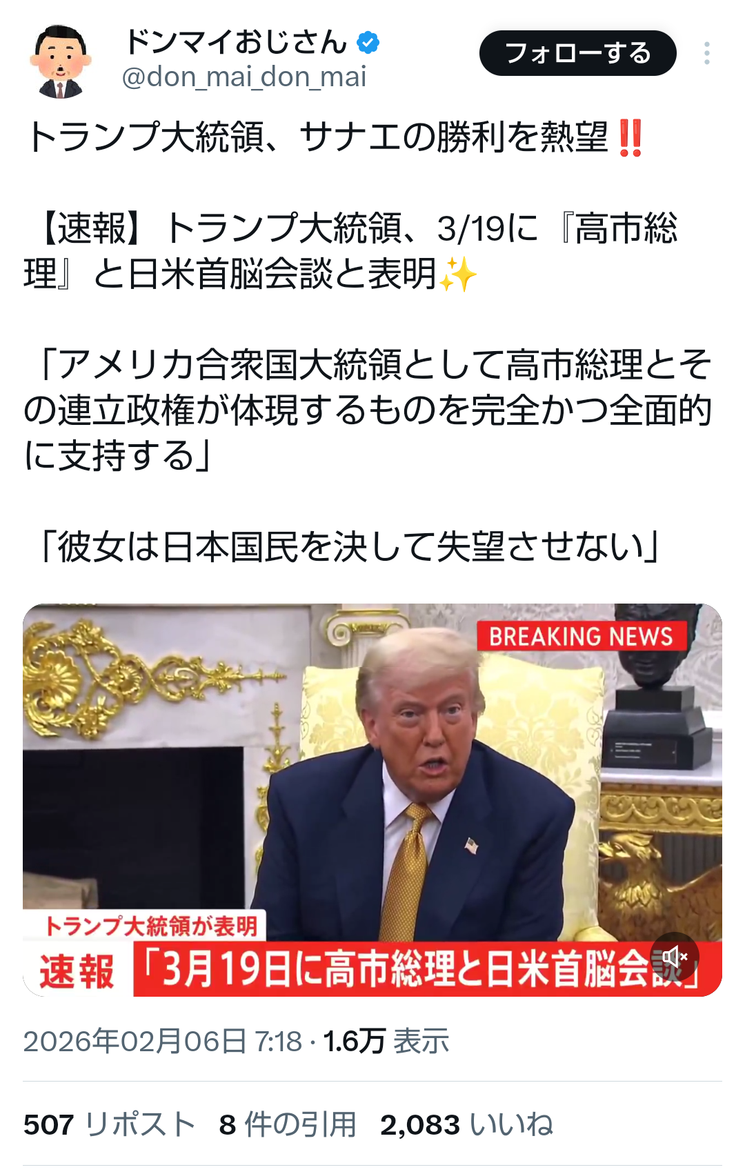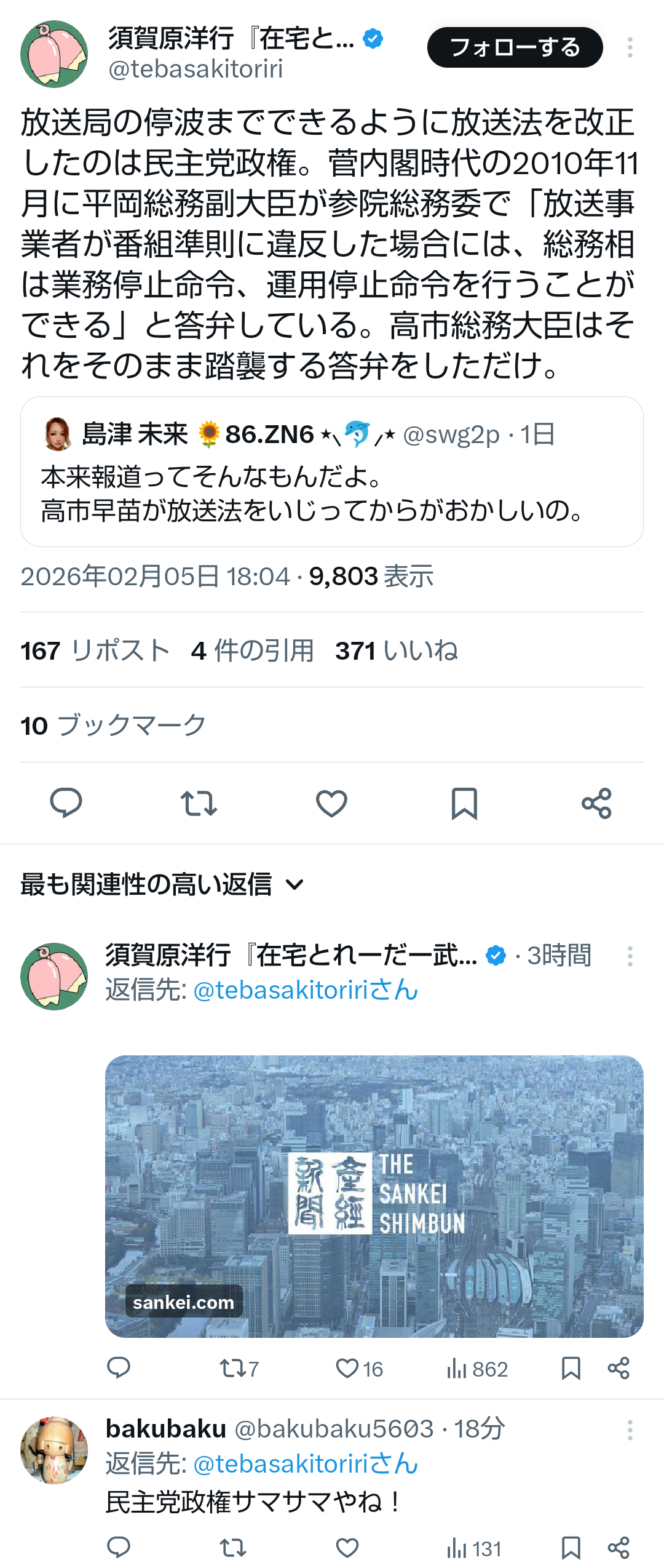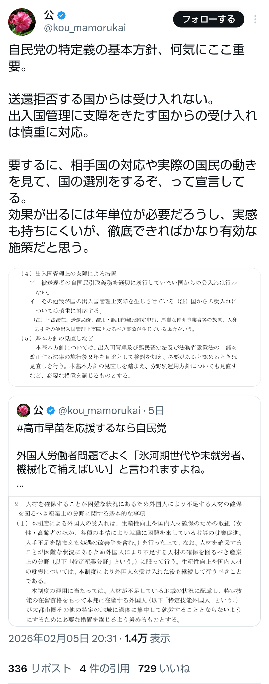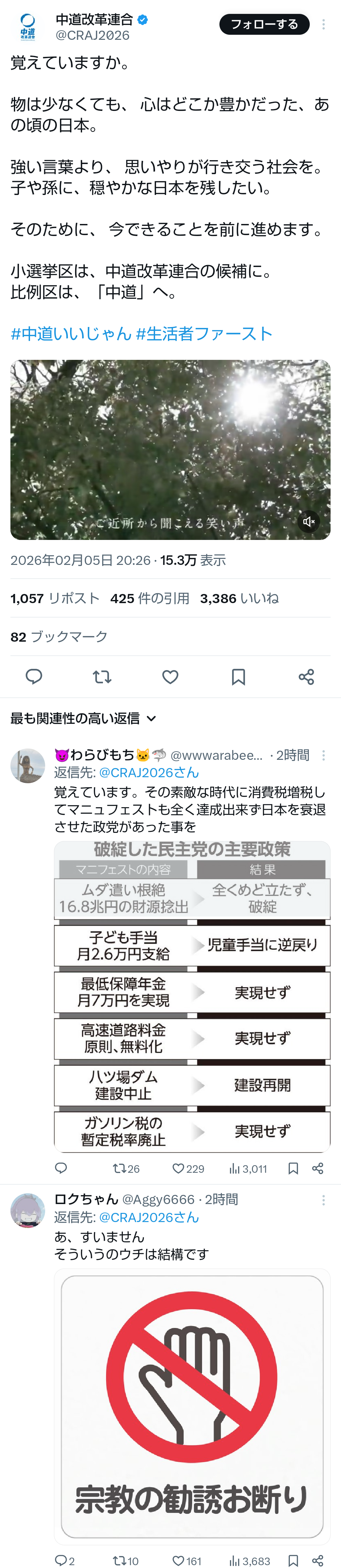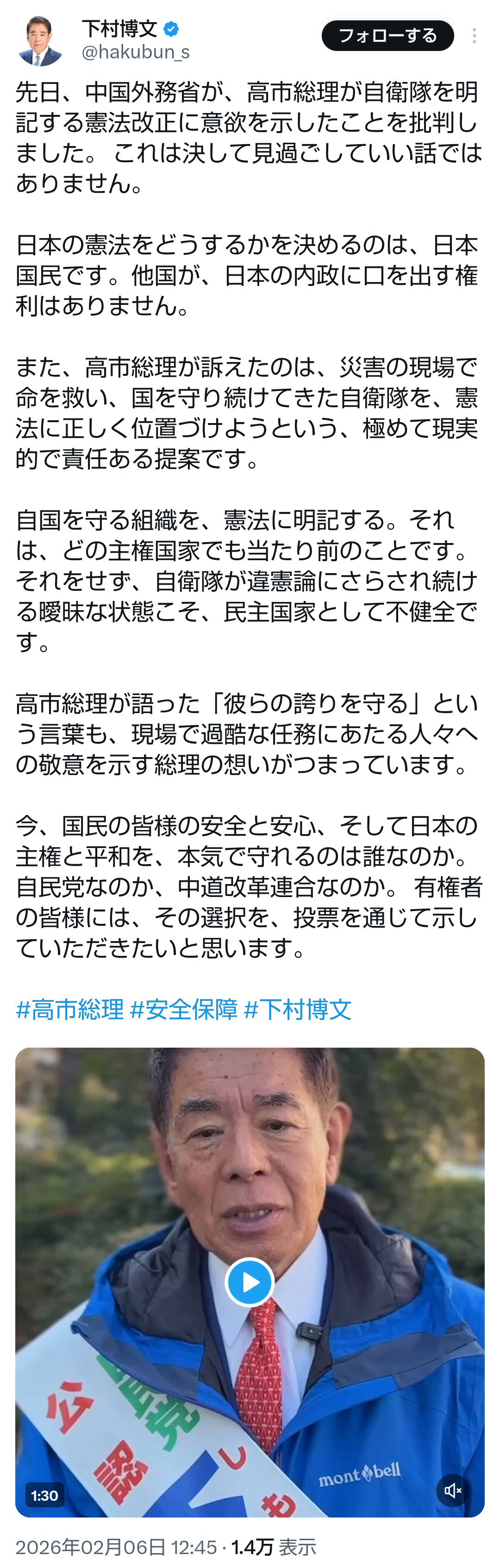 | … | 616無題Name名無し 26/02/06(金)15:42:09No.777590+ 1770360129393.png-(1572844 B) >先日、中国外務省が、高市総理が自衛隊を明記する憲法改正に意欲を示したことを批判しました。 これは決して見過ごしていい話ではありません。 |