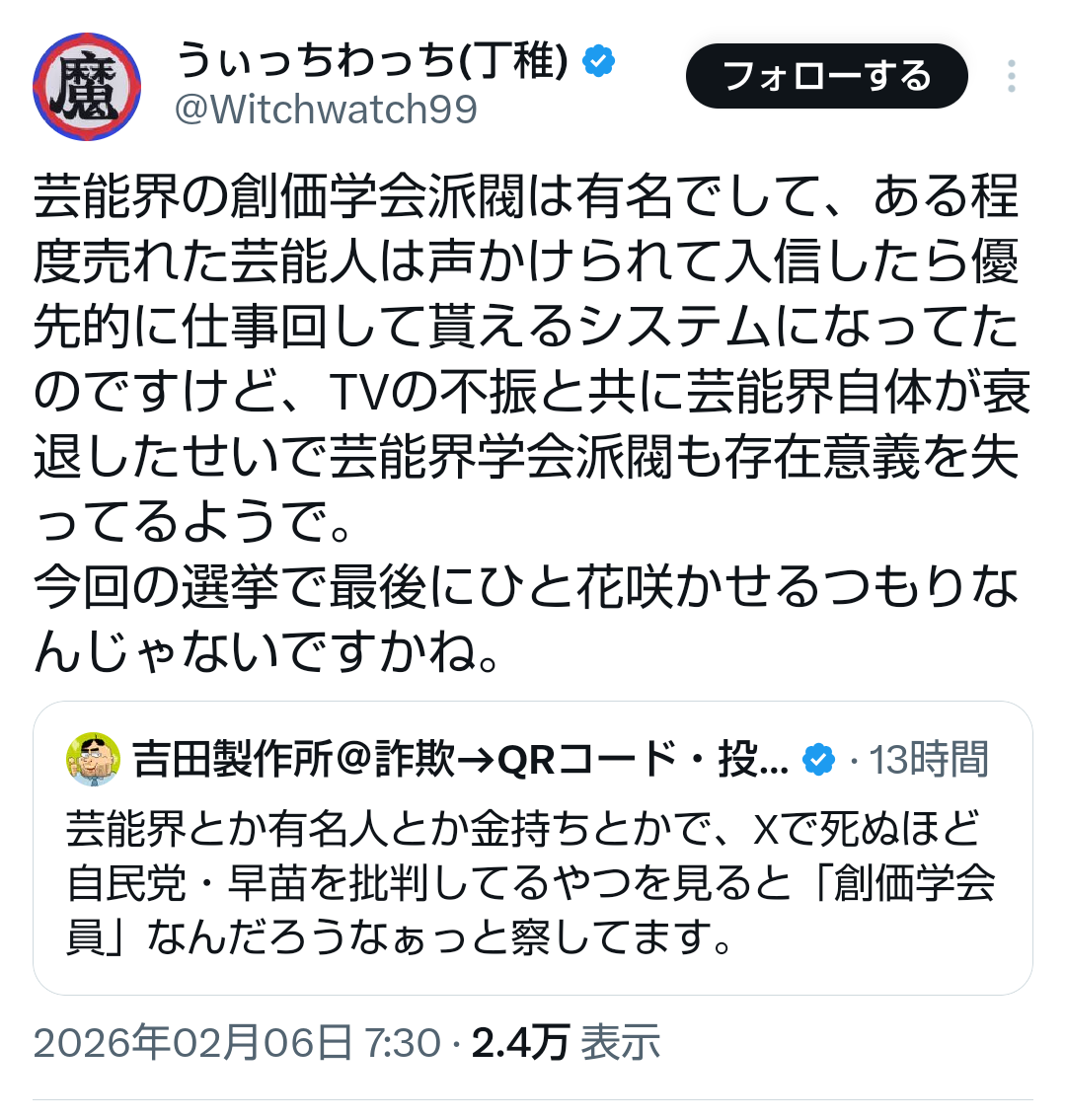| … | 14無題Name名無し 26/02/03(火)20:30:18No.776850そうだねx2単純に公明創価の中でも人気なさそうだもの斎藤 |