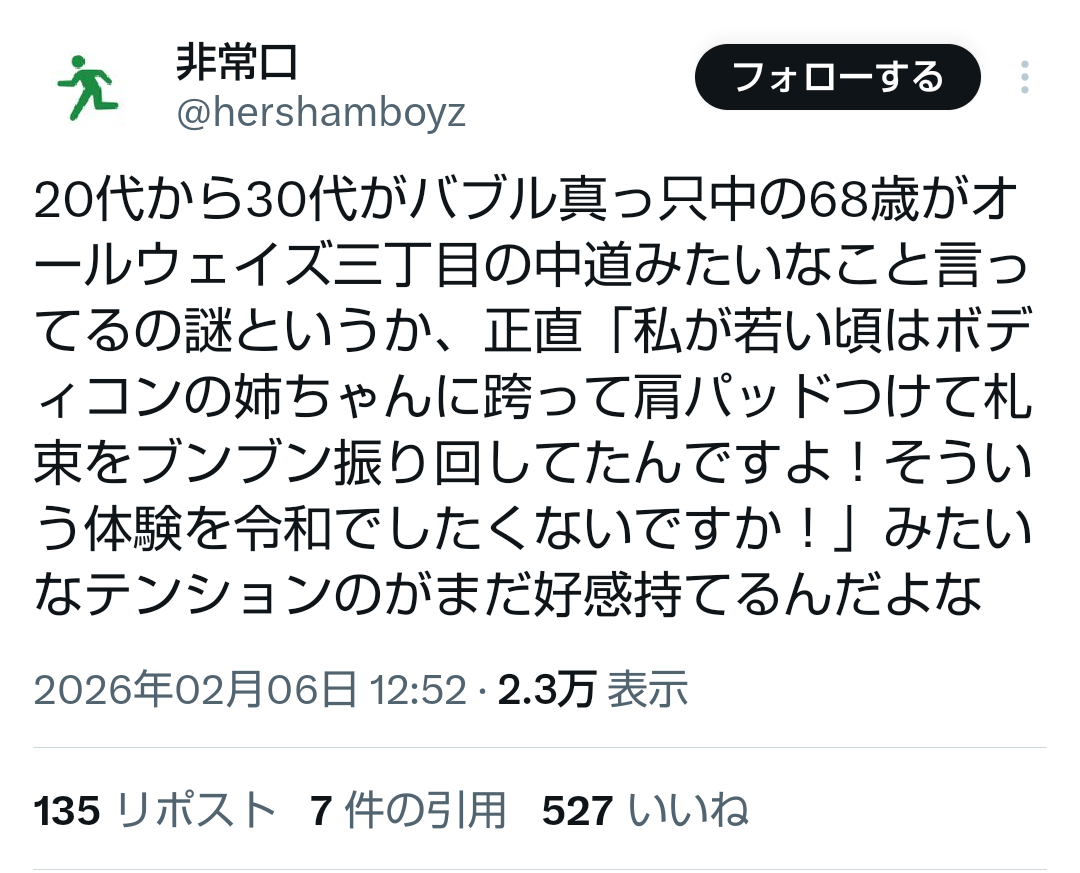 | … | 638無題Name名無し 26/02/06(金)17:28:54No.777612+ 1770366534726.png-(210032 B) >20代から30代がバブル真っ只中の68歳がオールウェイズ三丁目の中道みたいなこと言ってるの謎というか、正直「私が若い頃はボディコンの姉ちゃんに跨って肩パッドつけて札束をブンブン振り回してたんですよ!そういう体験を令和でしたくないですか!」みたいなテンションのがまだ好感持てるんだよな |