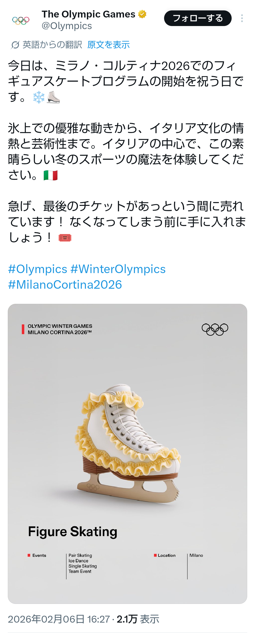 | … | 605無題Name名無し 26/02/06(金)14:31:38No.777579+フランス五輪がちょっとアレ過ぎだったからイタリア冬季五輪が普通でこう言うので良いんだよって感じてるわ・・・ |