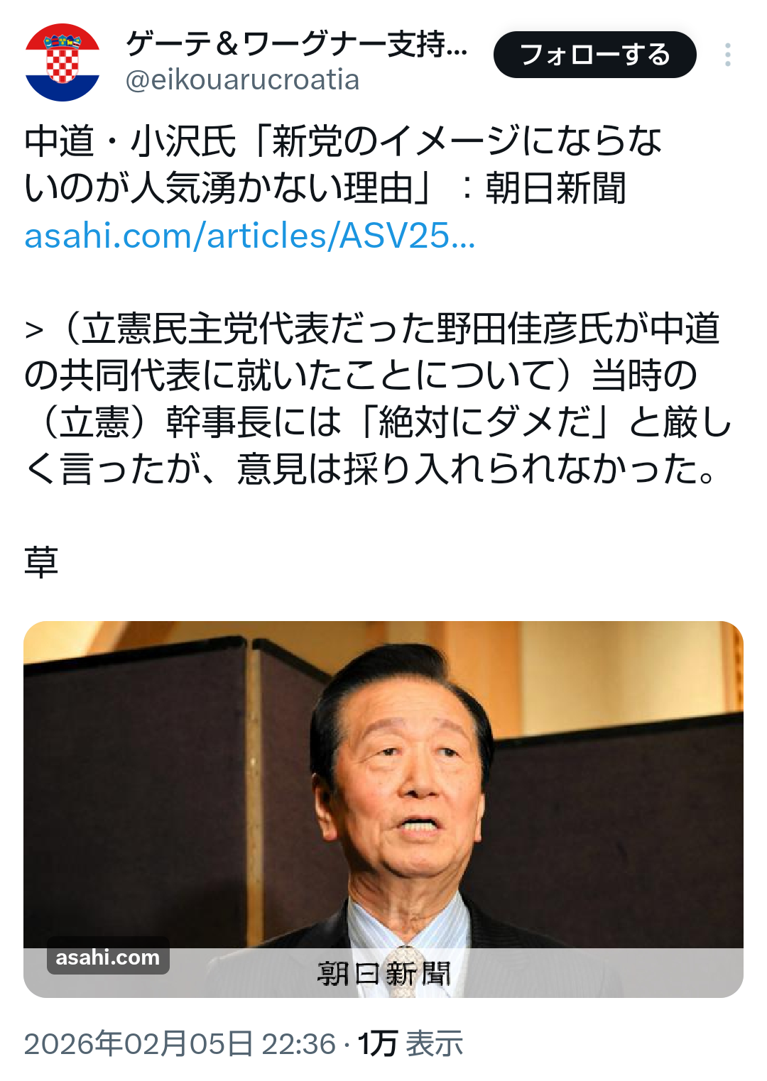 | … | 680無題Name名無し 26/02/06(金)18:42:50No.777654+ 1770370970476.png-(438109 B) >中道・小沢氏「新党のイメージにならないのが人気湧かない理由」 |