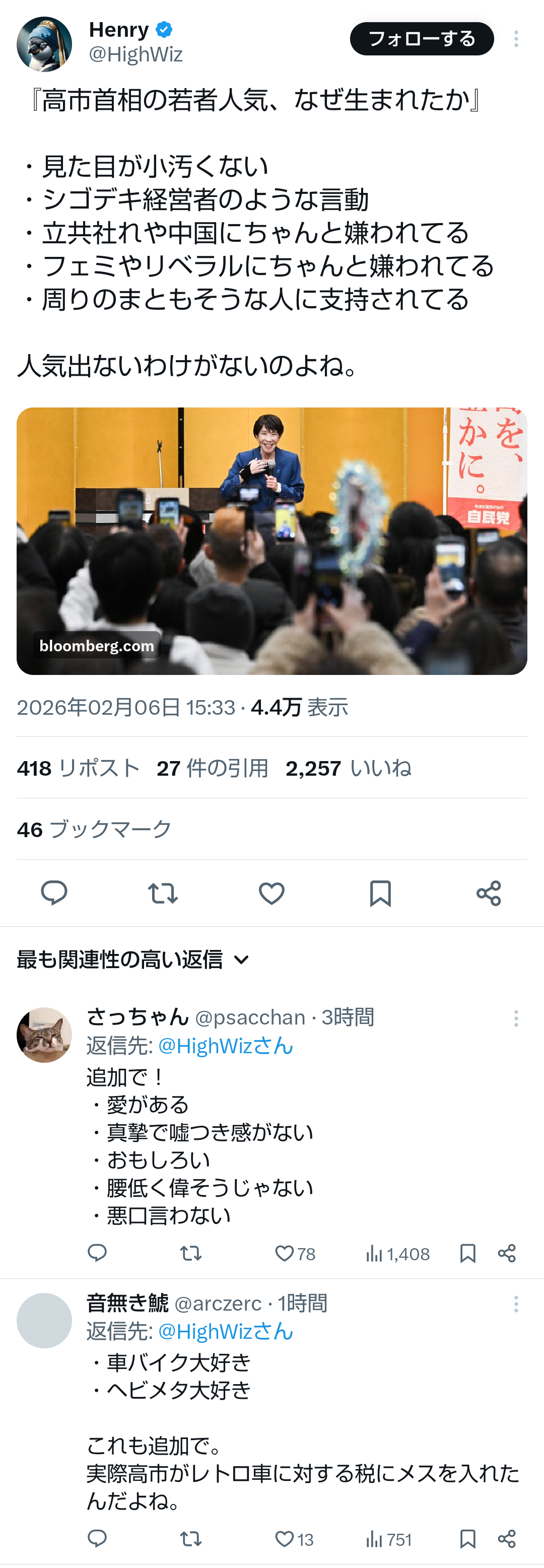 | … | 693無題Name名無し 26/02/06(金)19:25:50No.777668+ 1770373550110.png-(950696 B) >高市首相の若者人気、なぜ生まれたか−衆院選で試される「サナ活」の実力 |