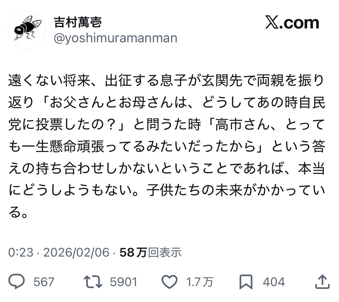 | … | 700無題Name名無し 26/02/06(金)20:21:50No.777676+ 1770376910693.jpg-(132429 B) 子供の未来が高市の起こす戦争でって言い出す人増えたな |