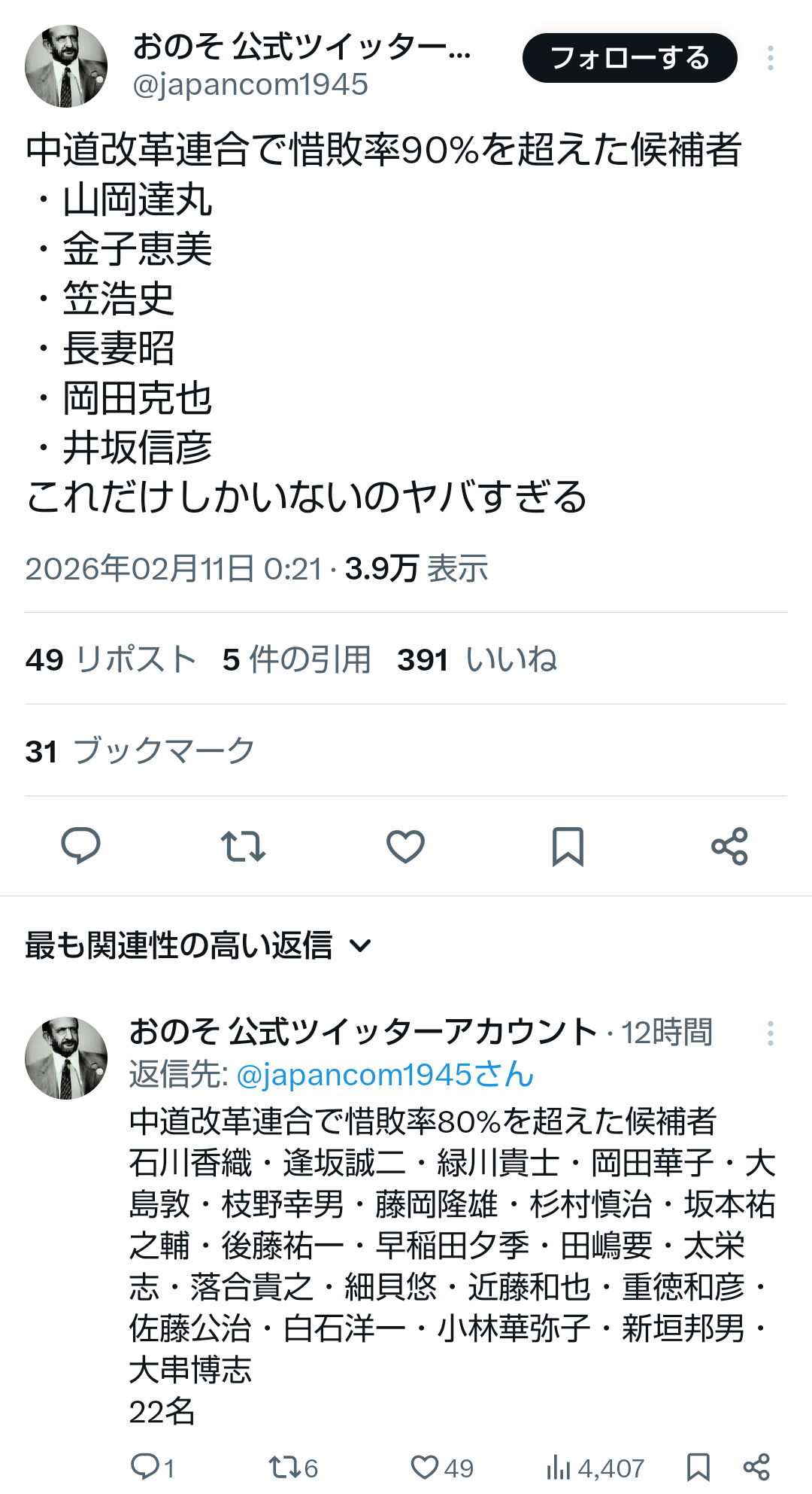 | … | 30無題Name名無し 26/02/11(水)13:23:11No.780358+ 1770783791448.jpg-(160185 B) >>衆院選で閣僚と副大臣、政務官の落選者がいない |