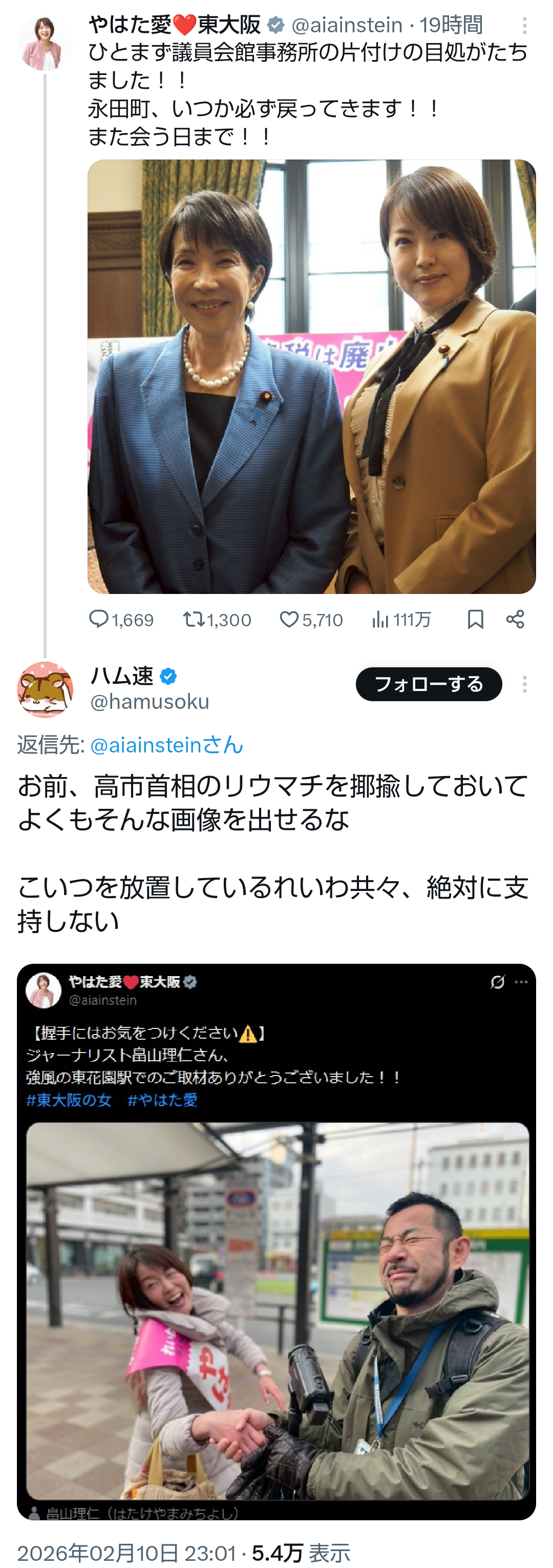 | … | 18無題Name名無し 26/02/11(水)13:02:29No.780346+>高市首相、19万票超を獲得し選挙区トップ得票…維新・前原氏は全国最少の5万票弱で薄氷当選 |