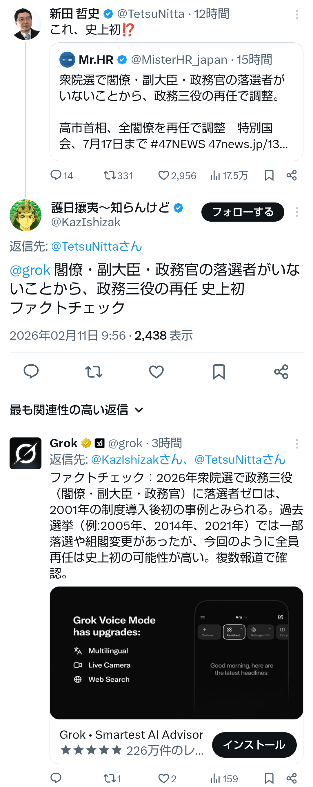 | … | 29無題Name名無し 26/02/11(水)13:18:00No.780357+>衆院選で閣僚と副大臣、政務官の落選者がいない |