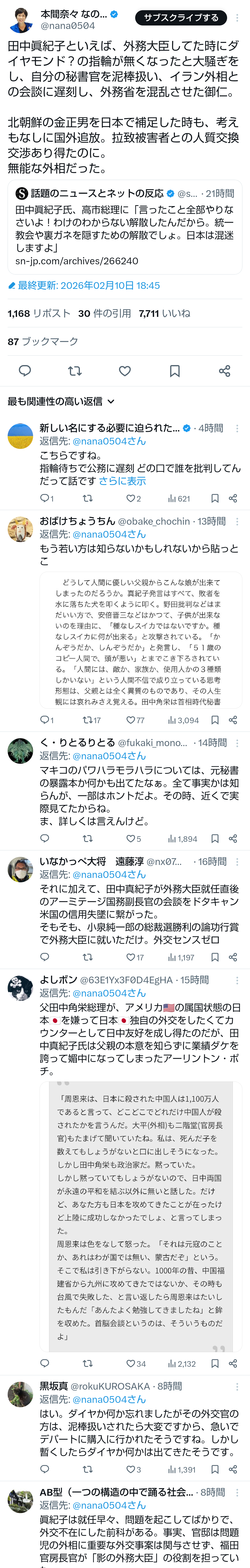 | … | 33無題Name名無し 26/02/11(水)13:29:55No.780361+ 1770784195560.png-(2258417 B) >田中眞紀子といえば、外務大臣してた時にダイヤモンド?の指輪が無くなったと大騒ぎをし、自分の秘書官を泥棒扱い、イラン外相との会談に遅刻し、外務省を混乱させた御仁。 |