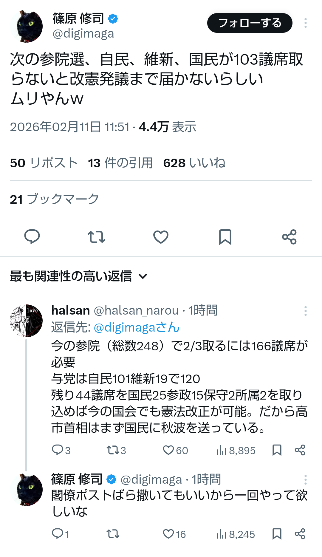 | … | 42無題Name名無し 26/02/11(水)13:48:46No.780370+ 1770785326205.png-(158063 B) >何故2/3確保したのに国民民主に声をかけてるかの理由 |