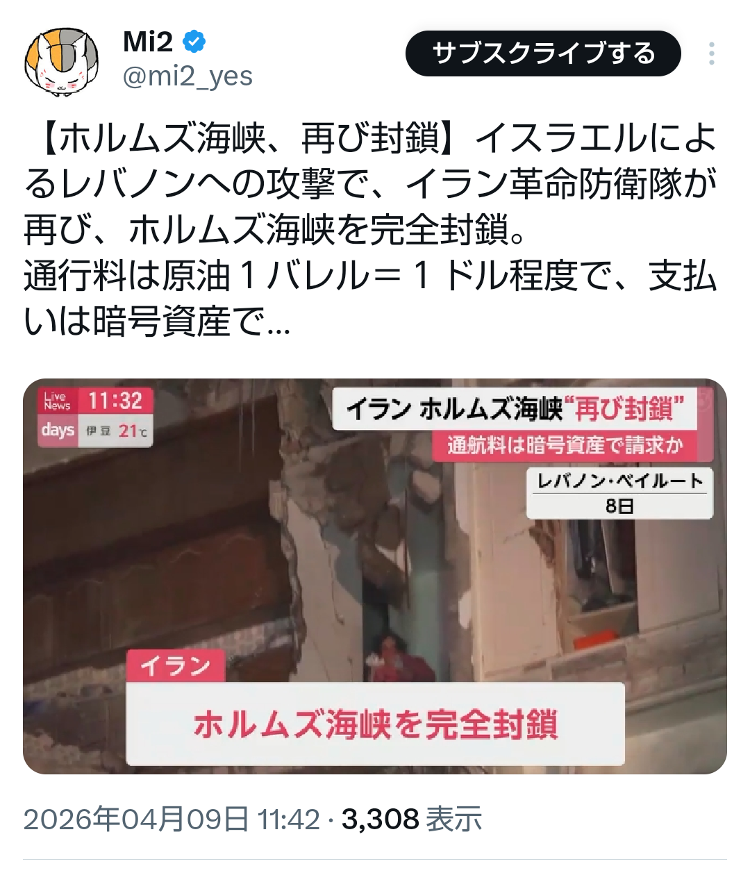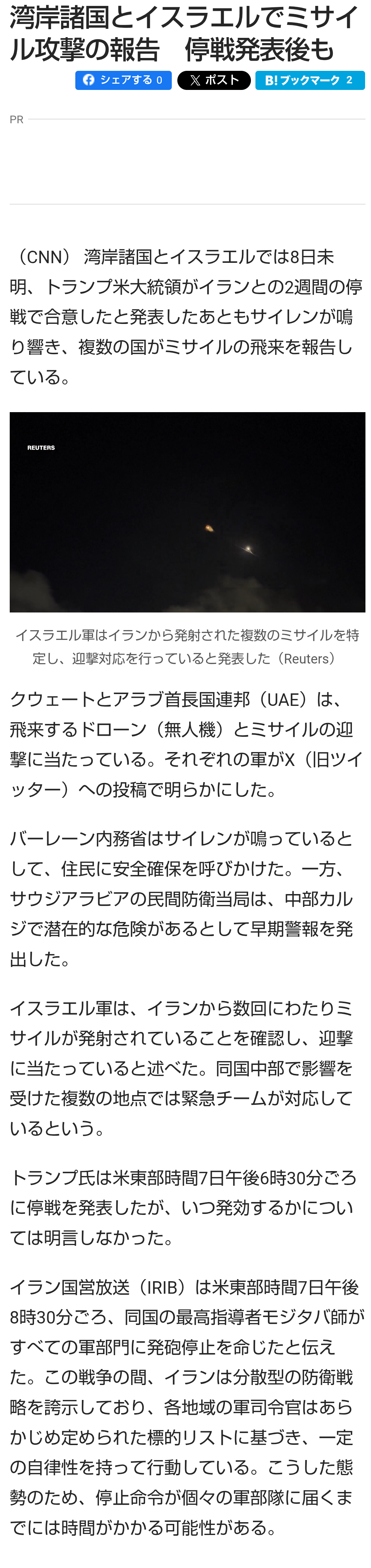| … | 8無題Name名無し 26/04/08(水)23:03:14No.791274+>停戦合意即革命防衛隊がミサイル攻撃したって奴は続報続かないしXのデマかな |