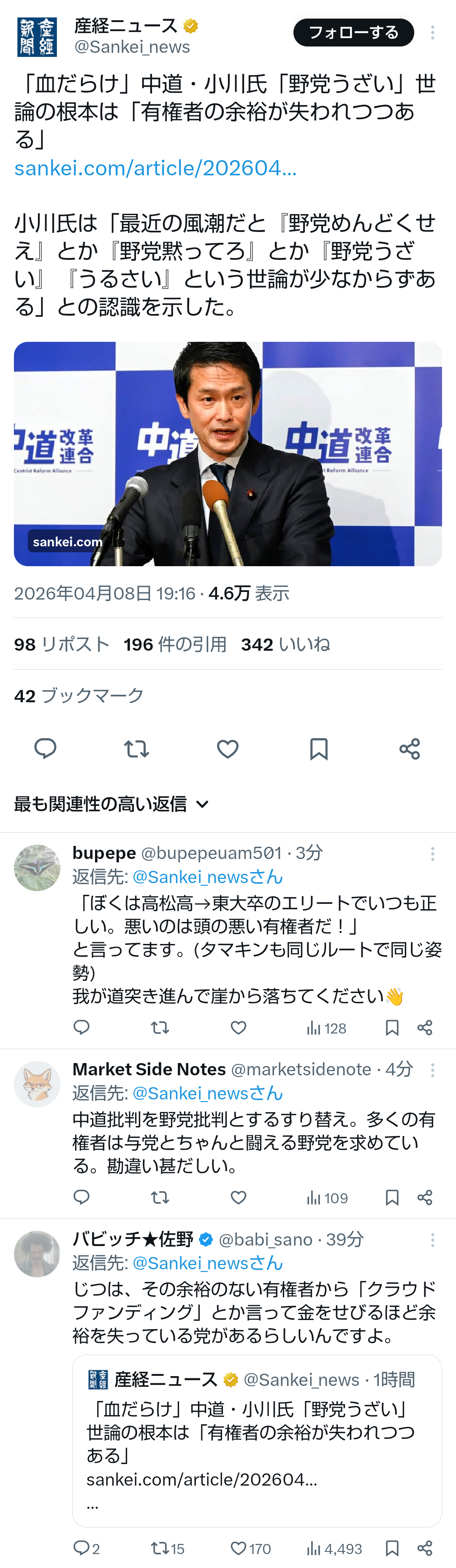 | … | 31無題Name名無し 26/04/09(木)09:27:40No.791298+>>中道改革連合の小川淳也代表は8日朝のラジオ日本番組で、野党に批判的な風潮や世論がある背景について、「有権者の暮らしのゆとりや精神的な余裕が社会から失われつつあるのが根本なのではないか」と述べた。 |